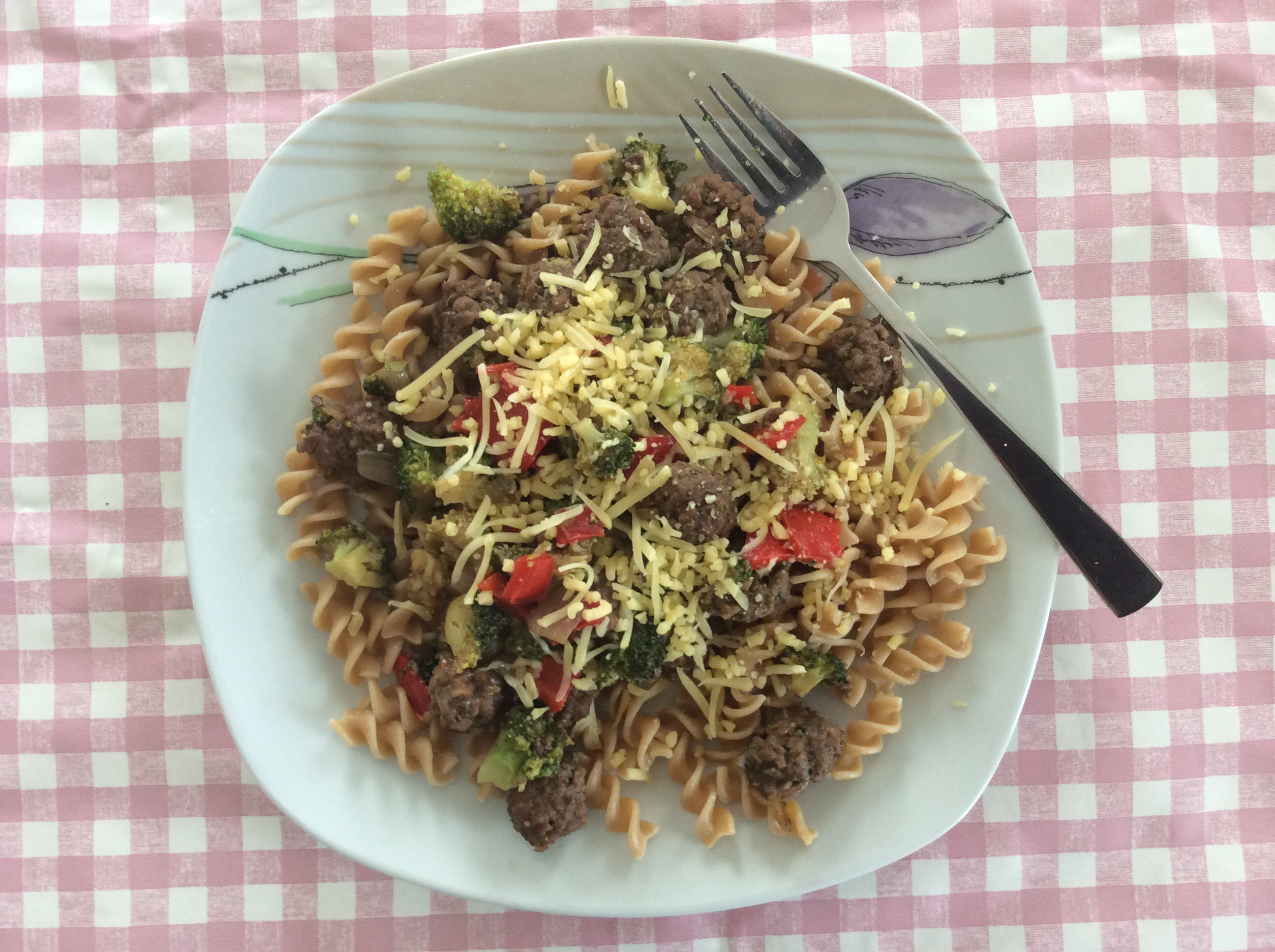 Het gehakt bracht ik op smaak met zout, peper en chilipoeder en ik draaide er balletjes van. Deze gingen met een flinke scheut olijfolie in een diepe koekenpan. Deksel erop en ondertussen sneed ik de broccoli, ui en paprika klein. Dit ging ook in de pan en liet ik gaar pruttelen. Ondertussen kookte ik volkoren pasta. Toen deze nog een minuut moest deed ik een scheut ketjap bij de gehakt en groente en zo liet ik het doorpruttelen.