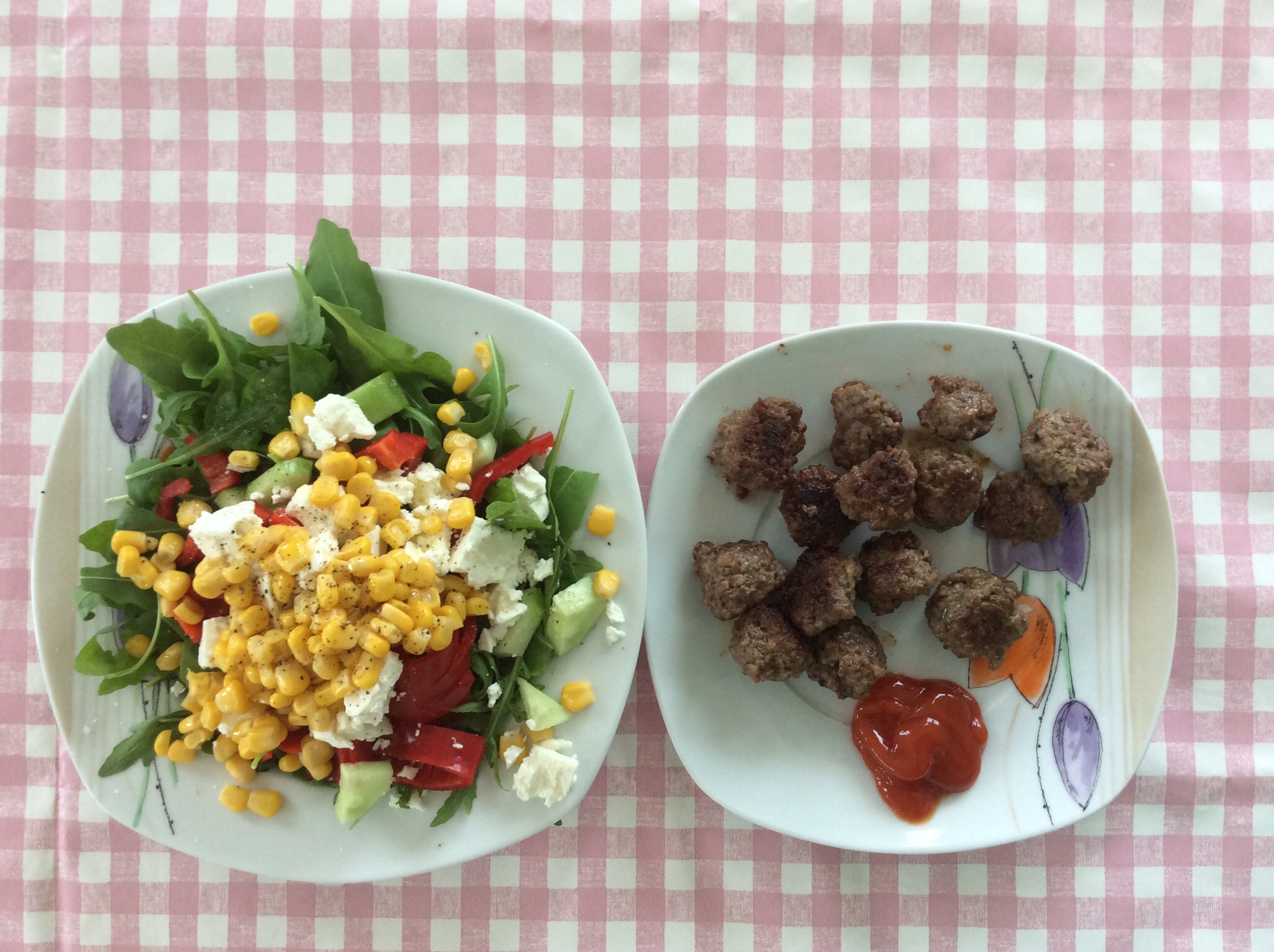 De gehakt breng je op smaak met zout, peper en Italiaanse kruiden. Ik doe dit altijd op gevoel. Dan draai je ze tot kleine balletjes en bak je ze in wat olijfolie bruin. De salade maakte ik met komkommer, een zoete puntpaprika, feta en maïs. Ik maakte het op smaak met zout, peper en olijfolie. Maar je kunt natuurlijk variëren met wat je op dat moment in thuis hebt.