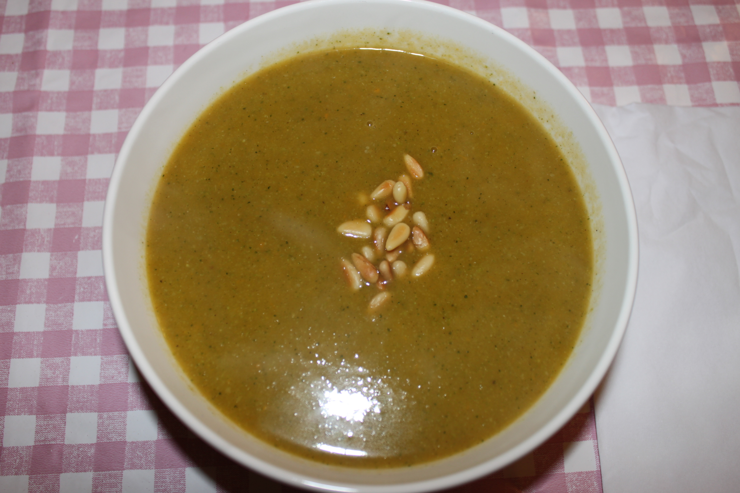 – Serveer de soep met de geroosterde pijnboompitten als garnituur.