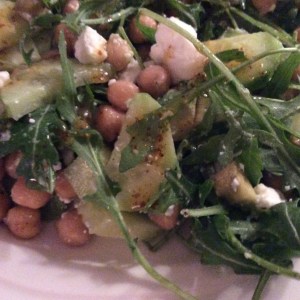 Giet de kikkererwten in een vergiet en spoel af totdat het schuim weg is. Doe in een kom. Snij de komkommer, olijven en avocado in stukjes/plakjes. Doe samen met de rucola bij de kikkererwten. Kruimel de feta er naar smaak over. Maak op smaak met zout en peper. Vergeet niet alles goed door elkaar te roeren.