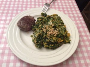 Zodra alles gaar is, giet je de aardappelen en de boerenkool af. Doe ze beide terug in de pan, doe de geitenkaas erbij (en eventueel ook peper) en stampen maar. Als alles goed gemengd/gestampt is, dan schep je het op twee borden. Maak af met de geroosterde pijnboompitten.
