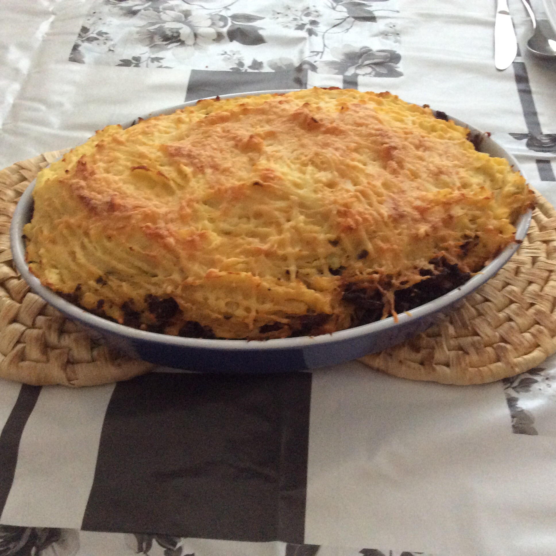 Pak nu een ovenschaal en vul deze. Begin met een laag aardappelpuree met zuurkool, vervolgens een laag gehakt, dan weer een laag puree, dan weer gehakt en eindig met puree. Maak het af met wat geraspte kaas.