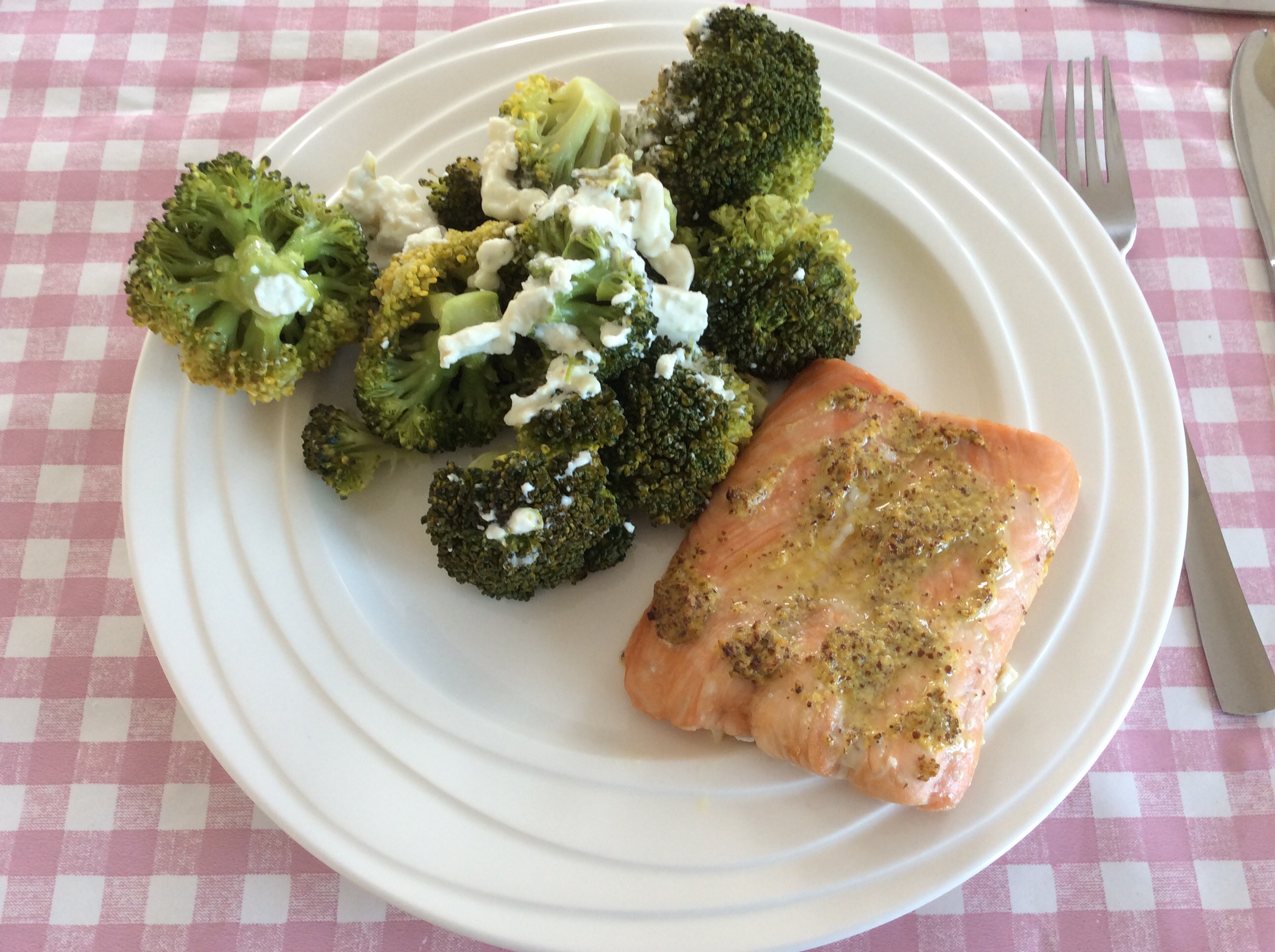 Ik probeer tenminste een keer per week vis te eten. Het lukt niet altijd, maar toch staat het regelmatig op het menu. Laatst maakte ik zalm met noedels,maar nu had ik zin iets anders. En dat werd zalm uit de oven met mosterd. Ik at er een halve broccoli met feta bij.