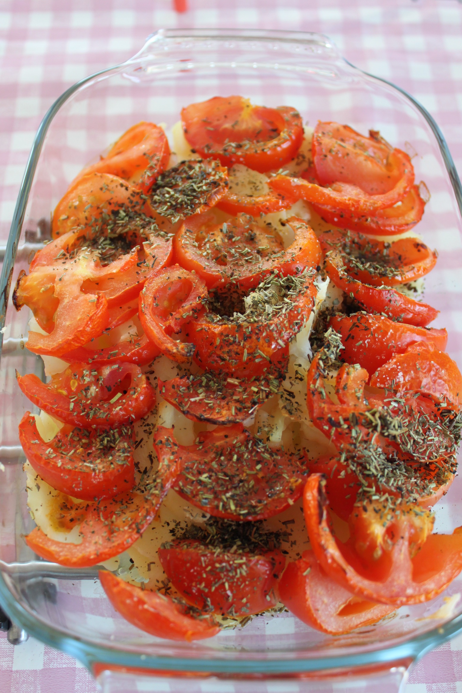 Kook de aardappelen in 15 minuten halfgaar. Snijd ze vervolgens in plakjes. Doe wat olijfolie in de ovenschaal en beleg nu de schaal met de aardappelschijfjes en tomaten. Bestrooi met zout en peper en de kruiden. Sprenkel de olijfolie erover en schuif de schaal in de oven. Na 20 minuten is het klaar. Eet smakelijk!