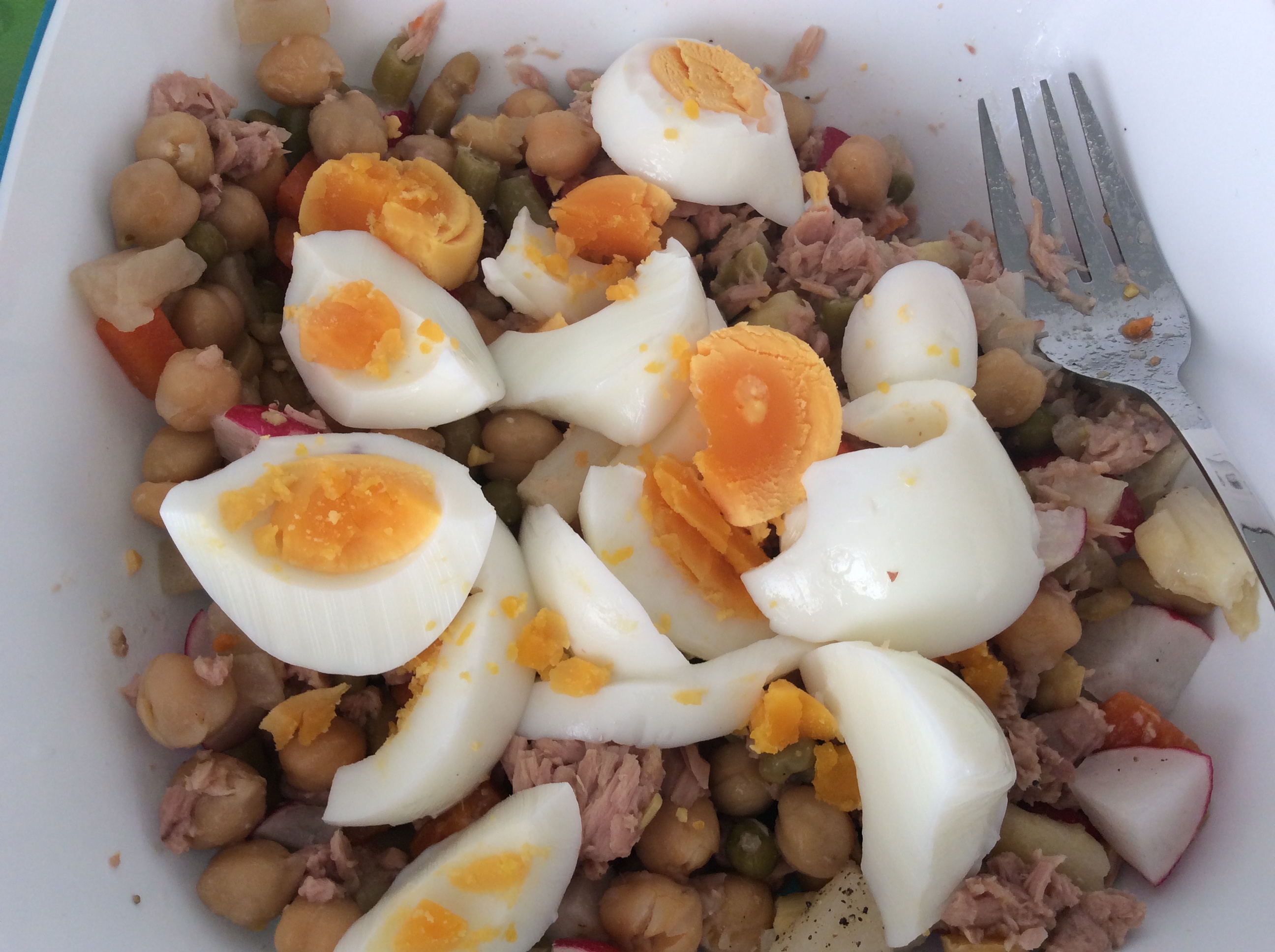 Laat de kikkererwten uitlekken en spoel goed schoon. Me g alle ingrediënten, behalve de ei, door elkaar en maak op smaak met olijfolie en zout. Leg de eieren er bovenop Et voilà! Eet smakelijk.