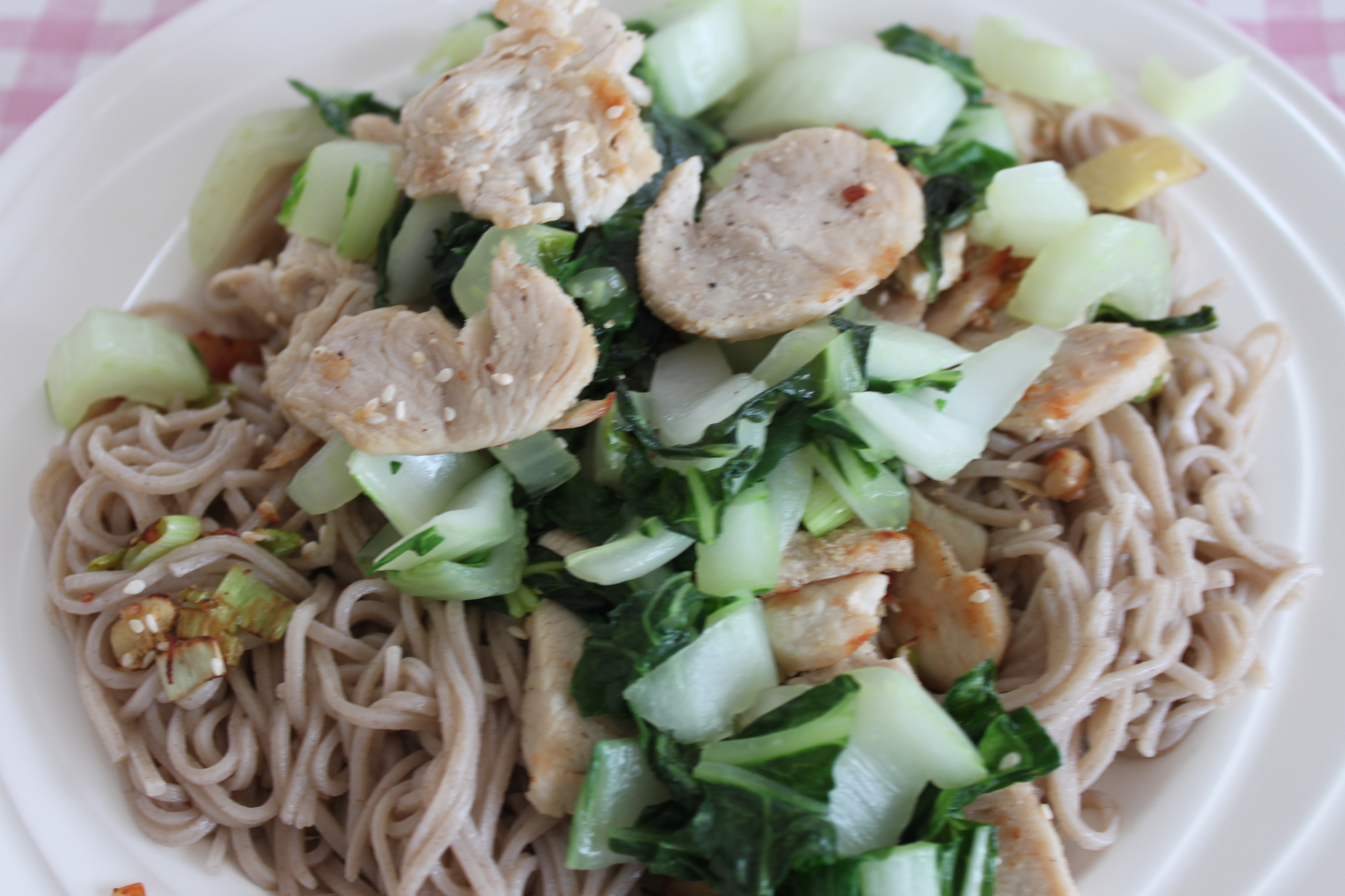 Onlangs zag ik het toevallig liggen en besloot er een gerecht mee te maken. En dat werd deze in sesamolie gemarineerde kalkoenfilet met paksoi en noedels.