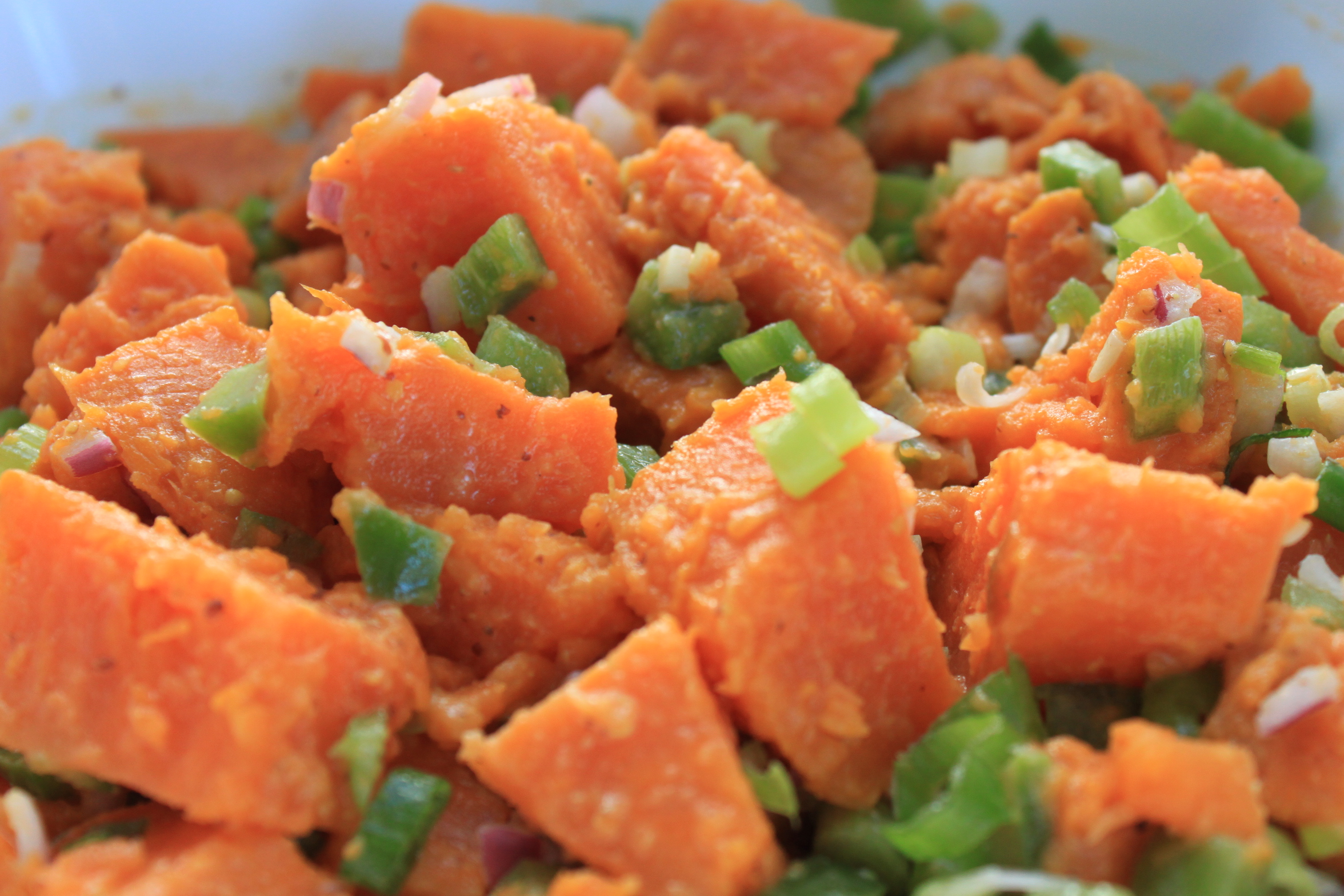 Voor deze makkelijk op maandag bedacht ik een zoete aardappelsalade, die ook zeer geschikt is als bijgerecht voor bij de barbecue. Vaak kom je bij barbecues de kant-en-klare aardappelsalades met ontzettend veel mayonaise tegen en daar word ik niet echt vrolijk van.