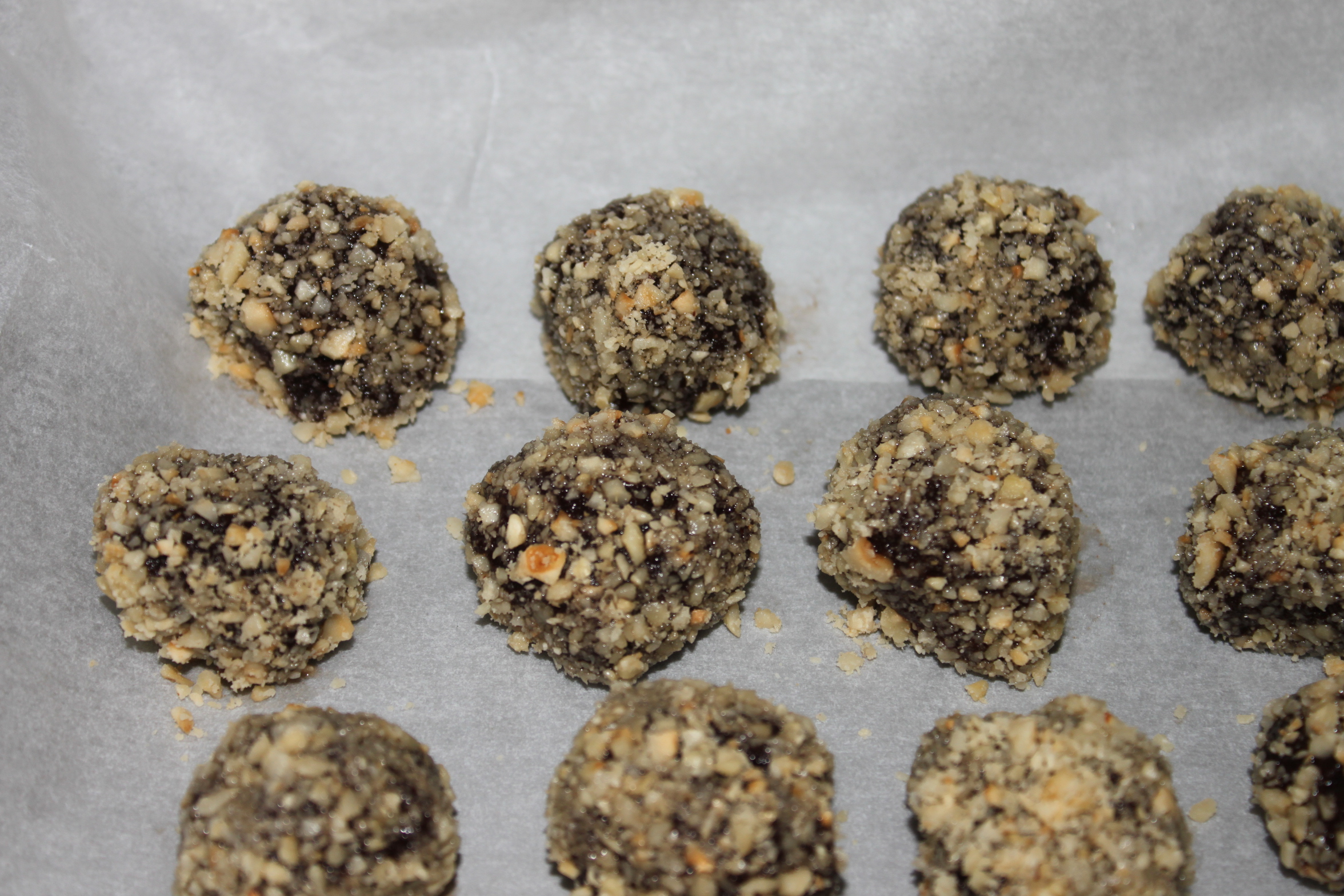 Leg een bakblik klaar en leg er bakpapier op. Draai 24 balletjes van het beslag en leg ze op de bakplaat. Haal nu de balletjes door de hazelnoten, leg terug en dek af en zet het bakblik weer in de koelkast.