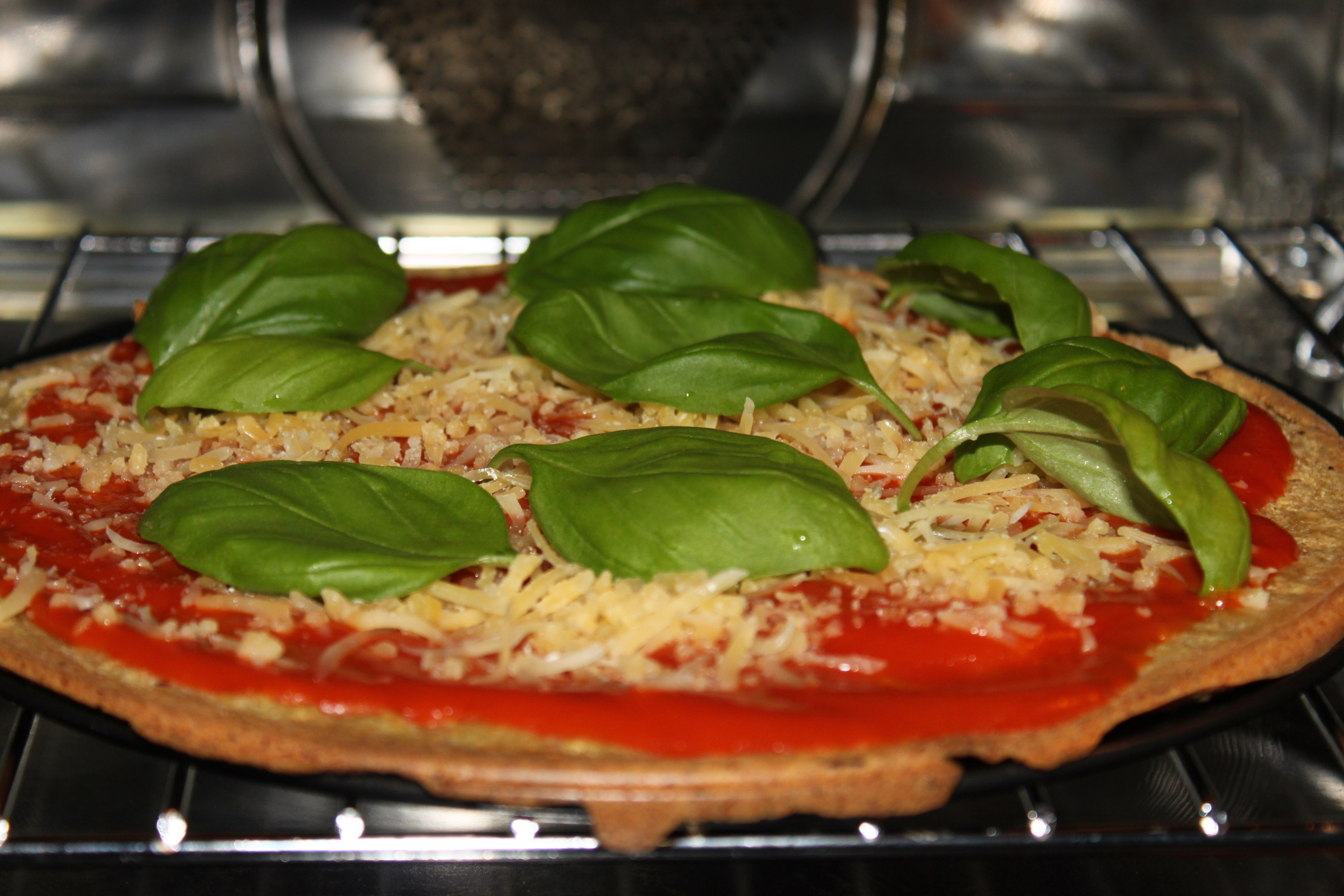 Ik maakte al een pizza met een bodem van rijst, maar deze is net even wat minder werk. En als je de bodem eenmaal gemaakt hebt, kun je eindeloos variëren met de toppings. Ik koos voor een simpele pizza met tomatensaus, basilicum en kaas, maar ik laat het aan jou om je eigen pizza hiermee te maken.