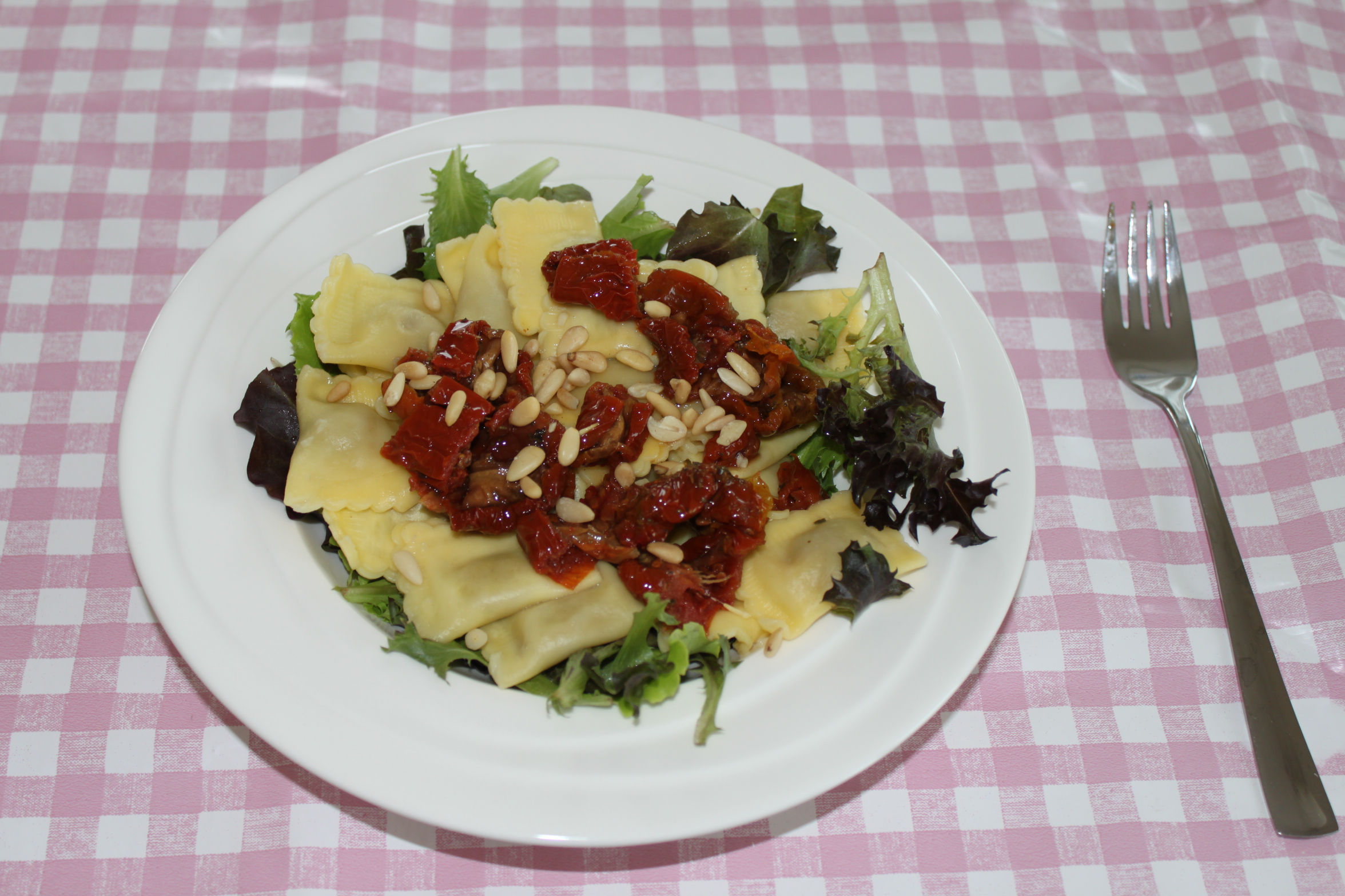 Kook de pasta volgens de instructies op het pak. Rooster de pijnboompitten. Snijd de gedroogde tomaten in reepjes. Pak nu twee diepe borden en leg er twee handjes sla per bord op. Leg hier de pasta en gedroogde tomaten op. Maak af met pijnboompitten. Eet smakelijk!