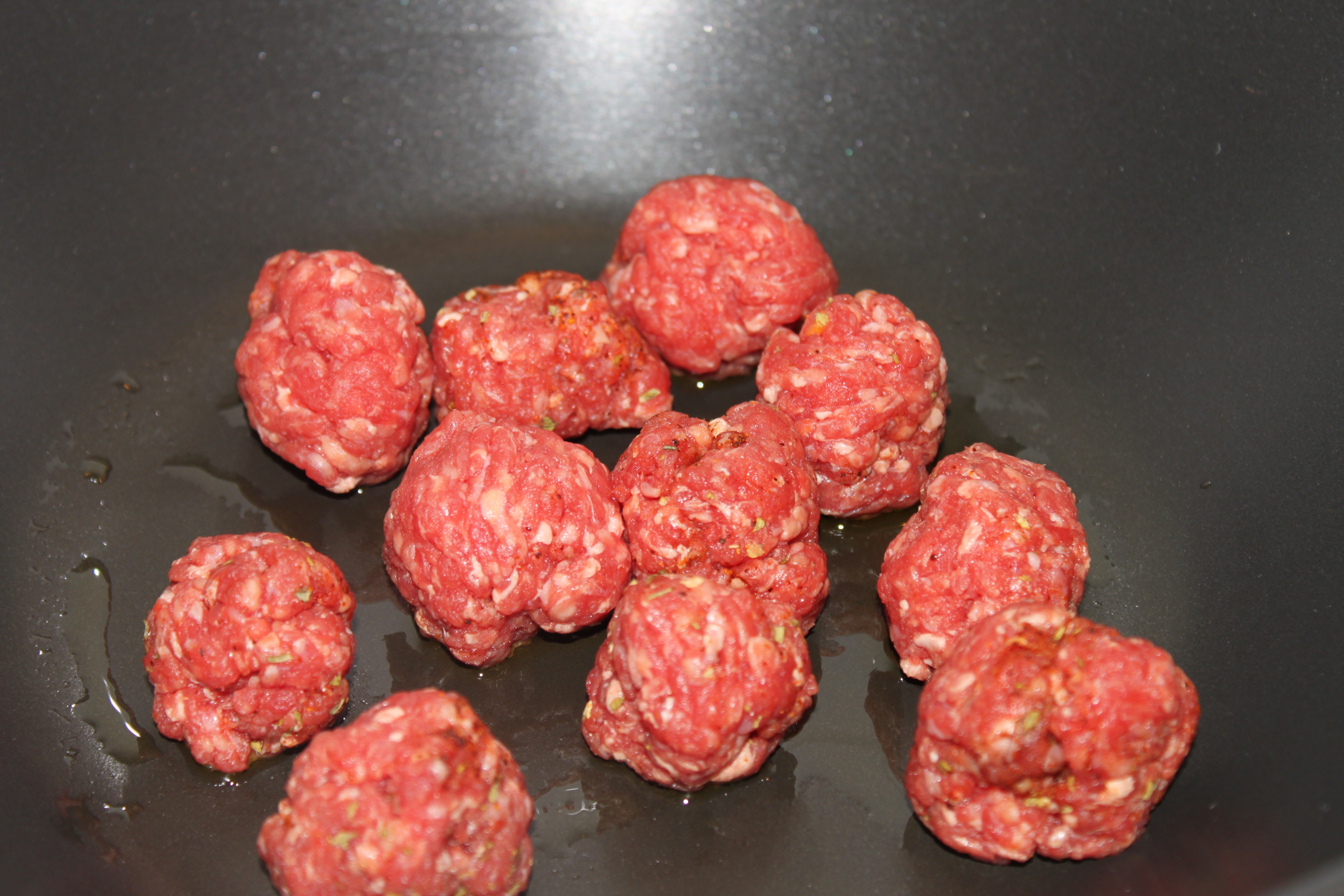Doe de kruiden bij het gehakt en meng goed. Verwarm wat olijfolie in een pan. Draai kleine balletjes van het gehakt en bak deze in de pan gaar. Ik zet het vuur niet heel hoog en doe een deksel op de pan, zo garen de balletjes sneller.