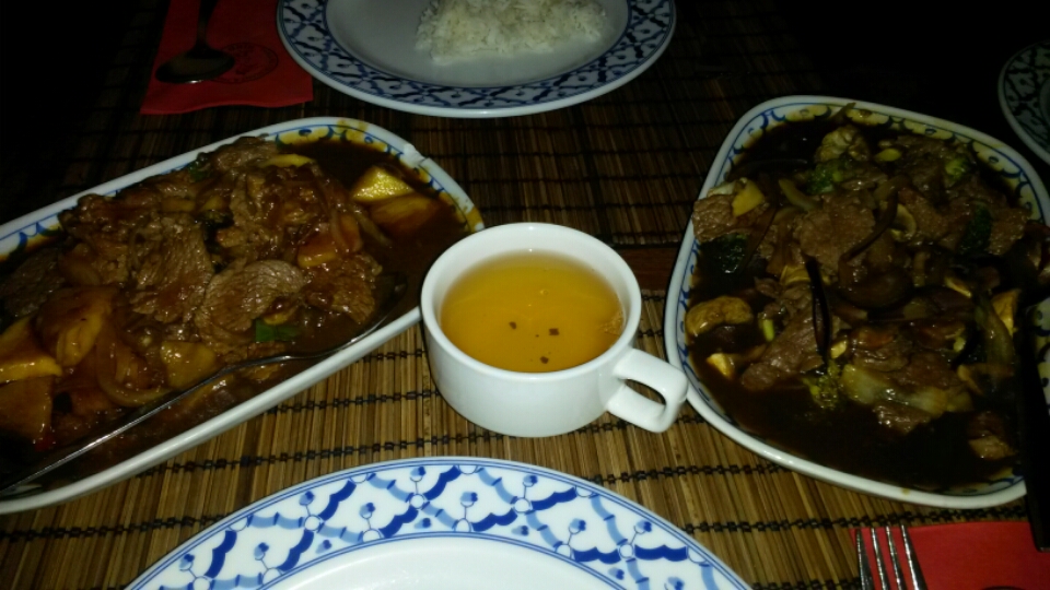 We kregen een tafel bij het raam toegewezen en bestelden wat te drinken. Ik koos voor de jasmijnthee en mijn vriend voor ice tea. Omdat de porties bij Bird erg groot zijn (vind ik dan) kozen mijn vriend en ik allebei alleen een hoofgerecht. Hij koos de biefstukreepjes met verse mango en ananas en ik de biefstukreepjes en groenten in oestersaus. Het restaurant serveert er standaard witte rijst bij.