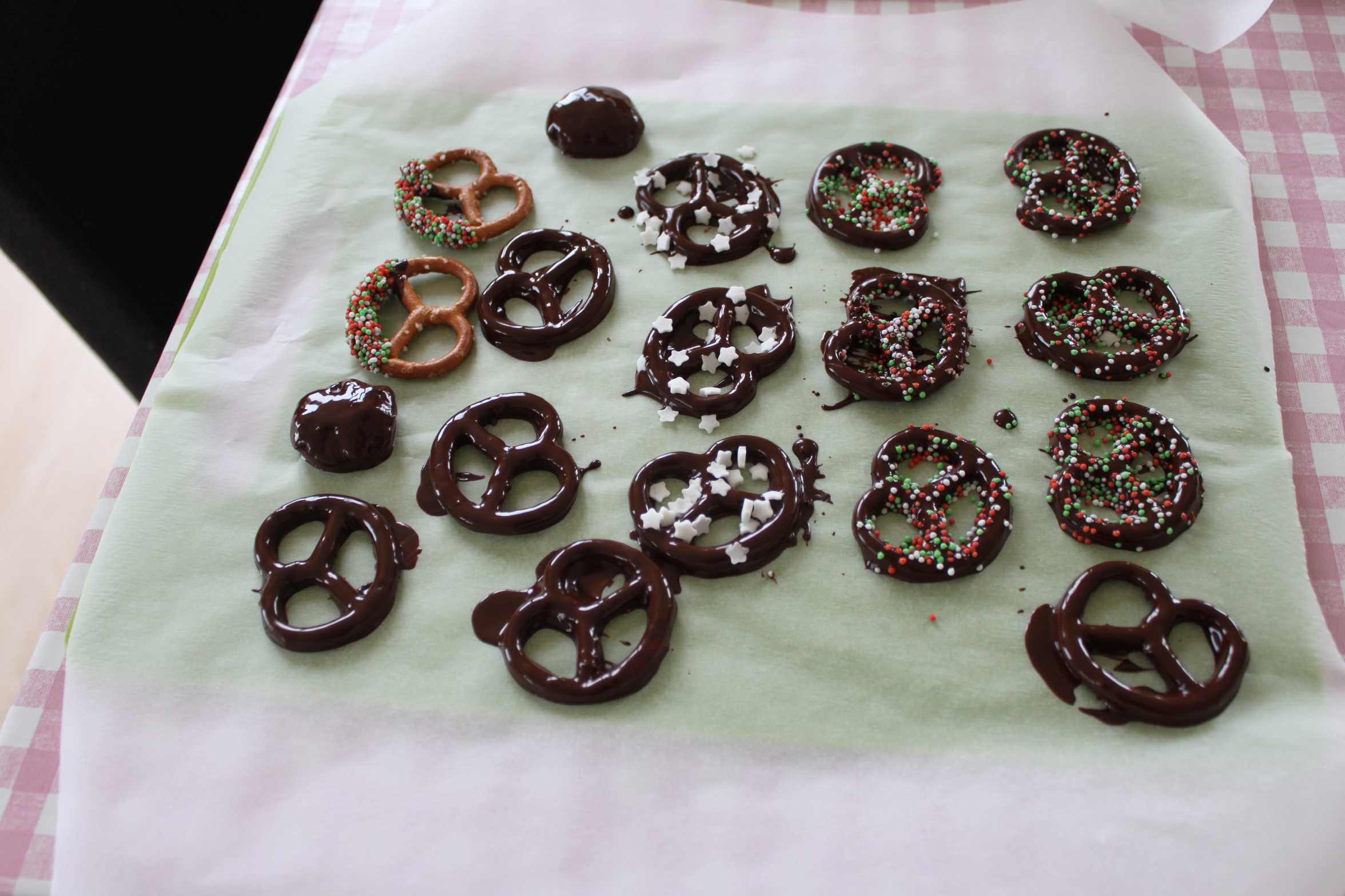 Ik had laatst een zak volkoren pretzels gekocht en wilde er iets anders mee doen dan zo maar op eten. Toen bedacht ik dat pretzels het heel goed zouden doen in combinatie met chocolade. Wat versiering erop en je hebt een feestelijke snack.