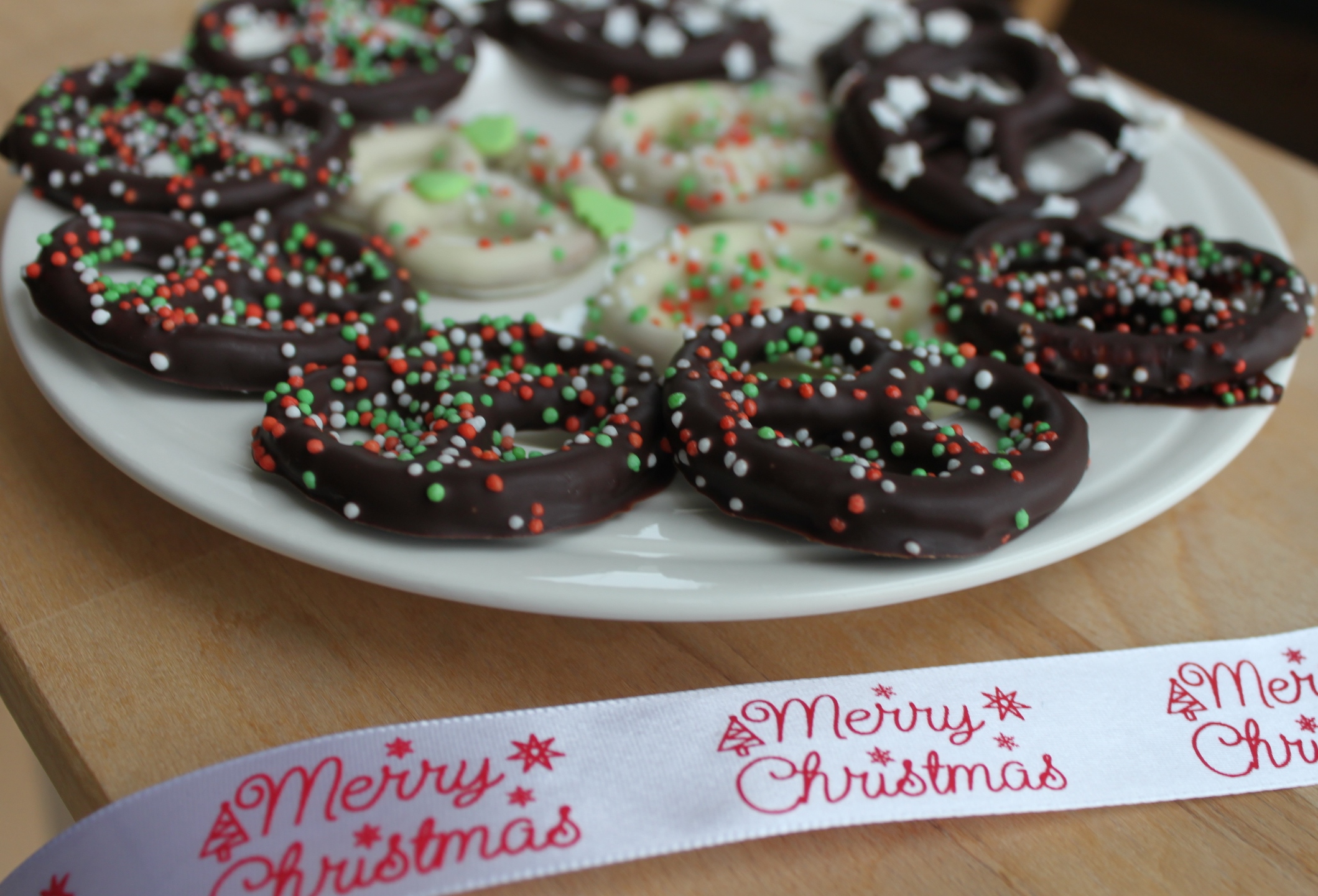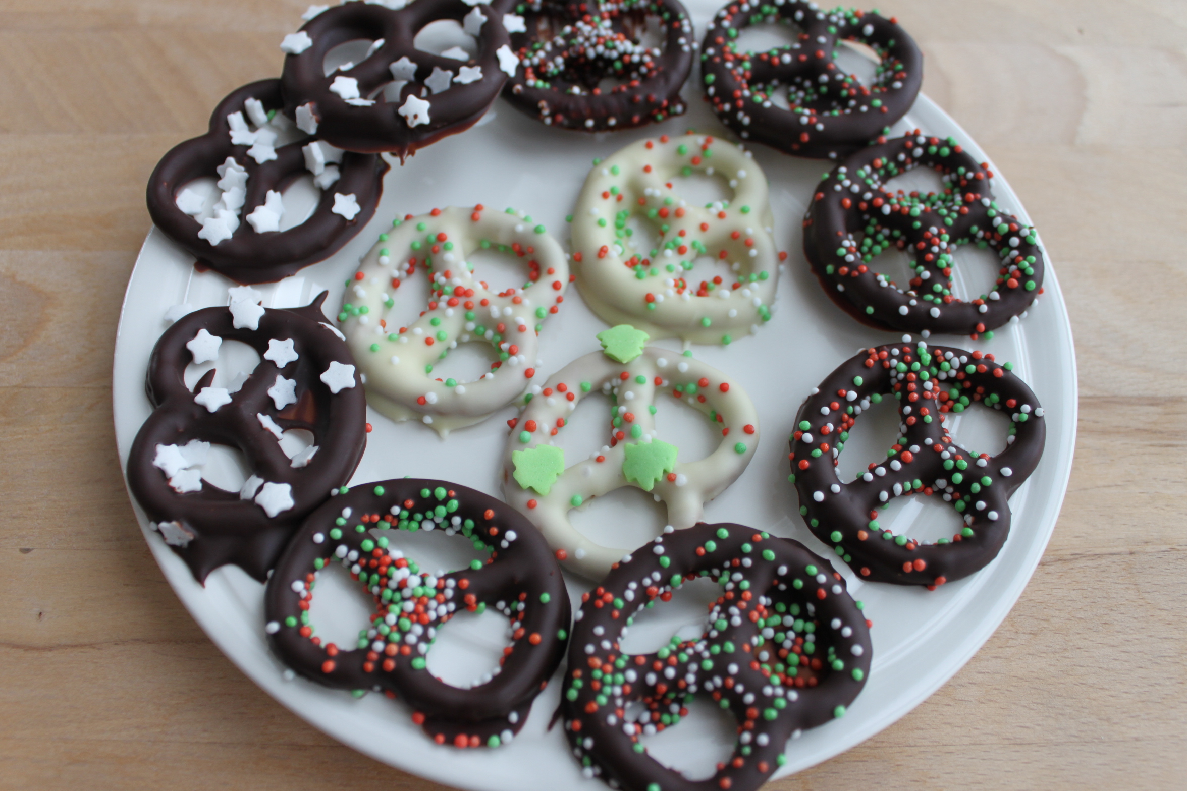 Serveer de chocolade pretzels op een mooi bord of hang ze in de kerstboom.