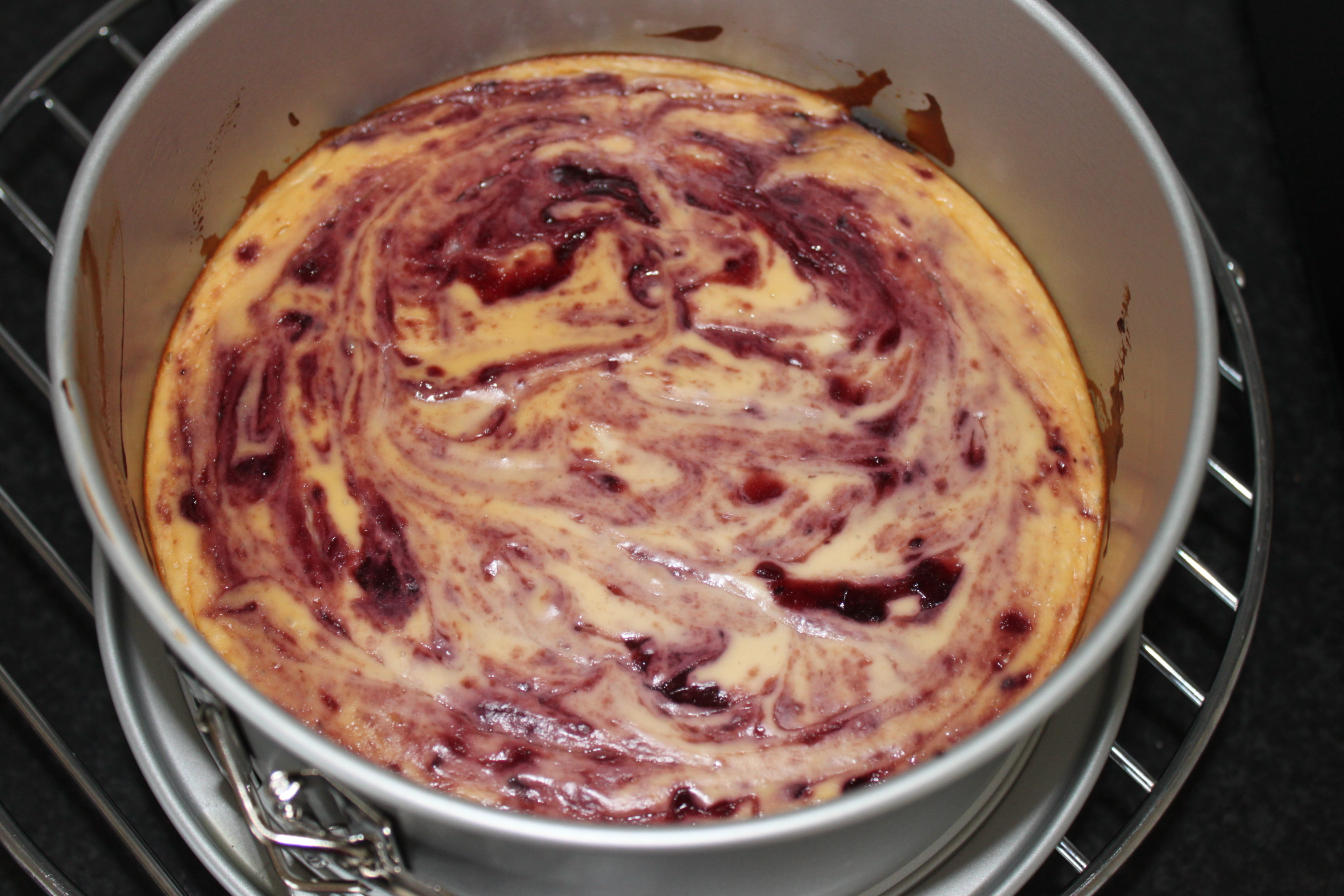 Giet het mengsel over de koekbodem en strijk glad. Verdeel de jam met een vork over de cheesecake en bak de cheesecake in ongeveer 25-30 minuten gaar. Dek eventueel af met folie als de bovenkant van de cheesecake te hard gaat.