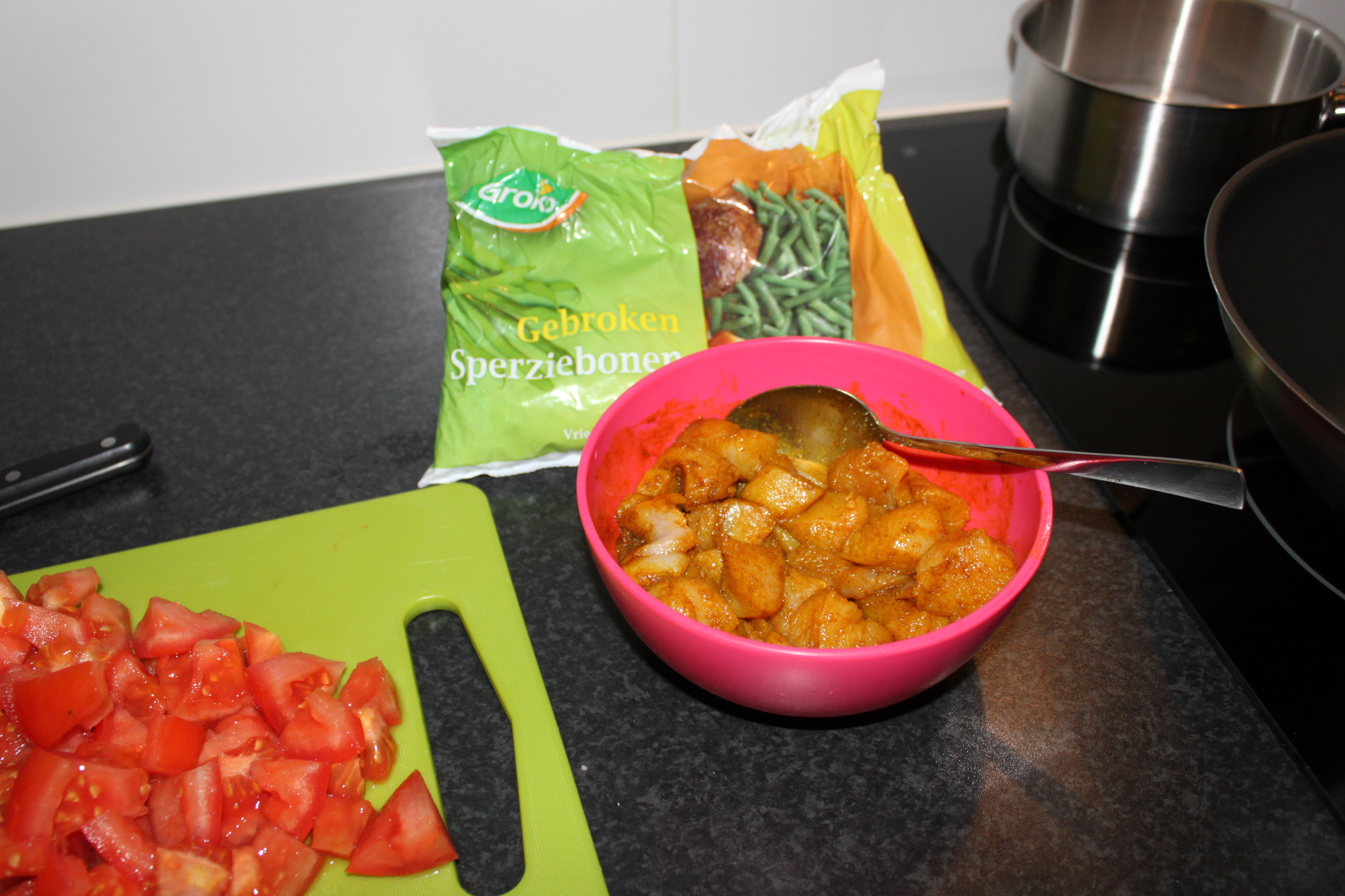 Doe een klein beetje olie in de pan en bak de ui en kipfilet bijna bruin. Voeg de sperziebonen toe en roer goed door. Voeg na een paar minuten de tomaten en nog een theelepel kerriepoeder toe en roerbak deze gaar. Breng op smaak met zout en peper.