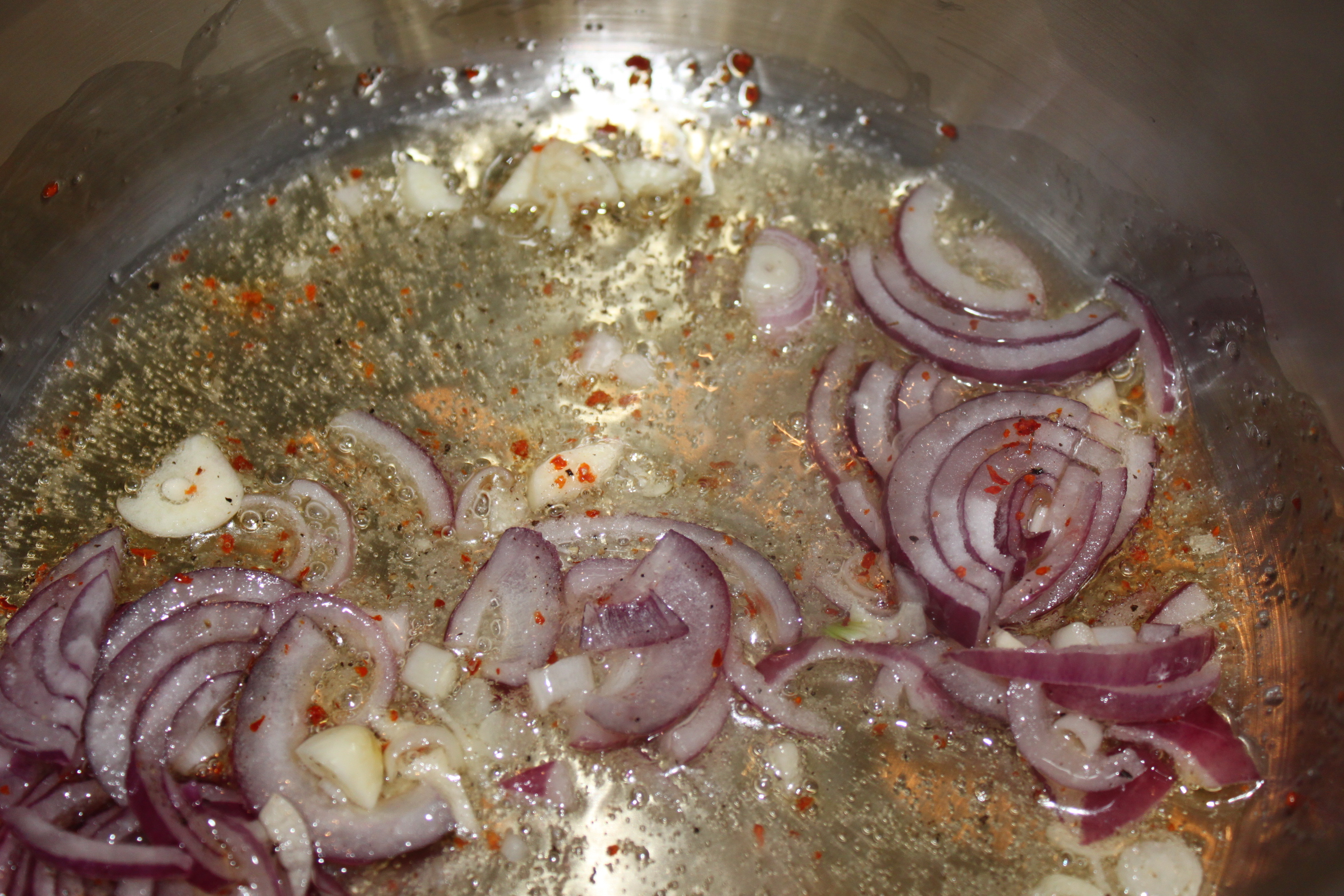 Verhit de helft van de olijfolie in een soeppan en fruit gedurende 15 minuten de ui en knoflook samen met het zout, de peper en chiliflakes. Als de ui glazig is, voeg je de verse tomaten en de rest van de olie toe. Zorg dat het warm wordt, maar laat het niet koken. Na 15 minuten voeg je de tomaten uit blik toe. Breng aan de kook, draai het vuur laag en laat een uur lang pruttelen.
