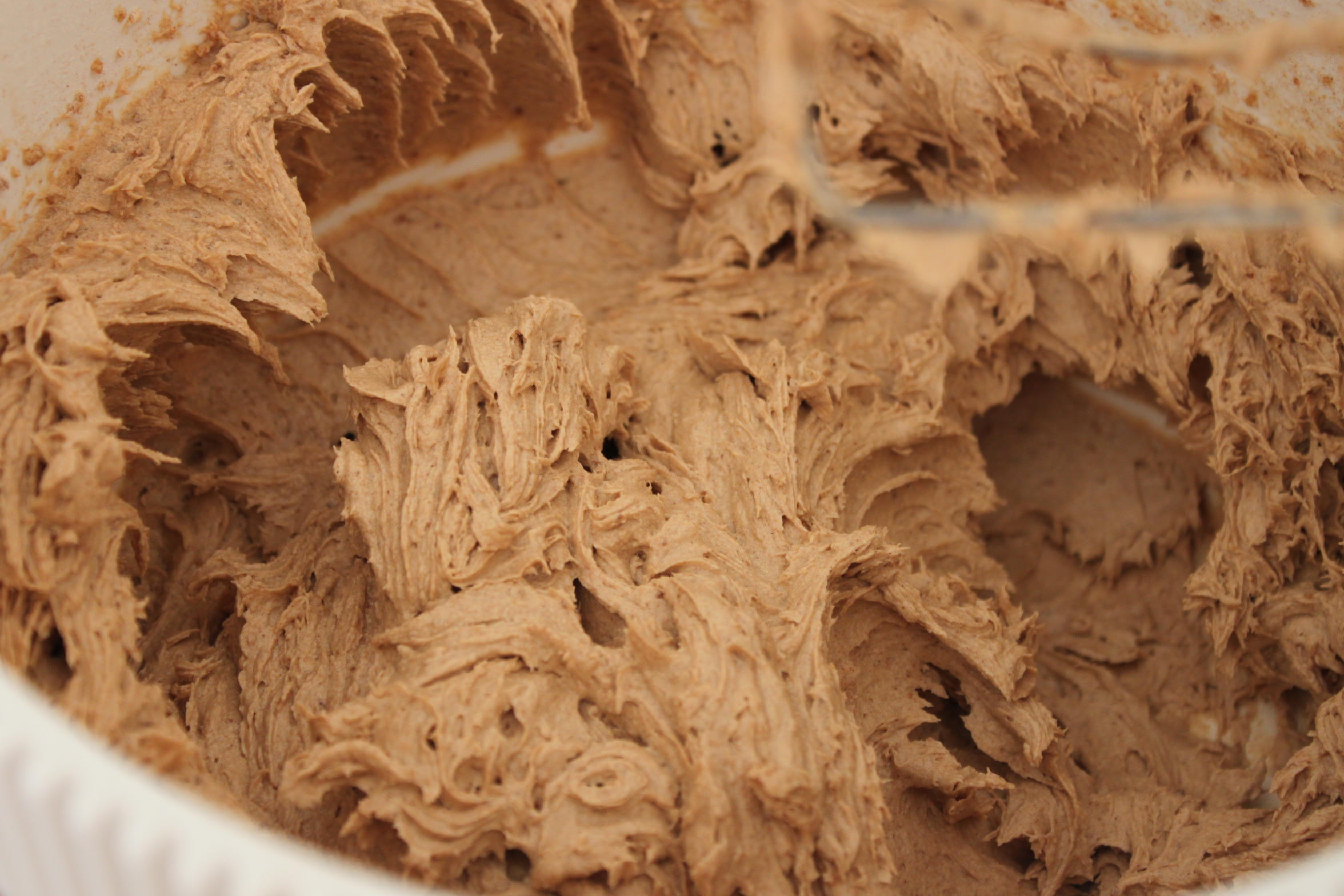 Mix op de hoogste stand de boter, kokosbloesemsuiker, vanillesuiker en het zout romig. Zet nu de mixer iets minder hard en voeg vervolgens een voor een de eieren toe. Mix tot een glad beslag en mix vervolgens nog even op de hoogste stand. Voeg nu beetje bij beetje het bakmeel en kaneelpoeder toe en mix tot een glad beslag.