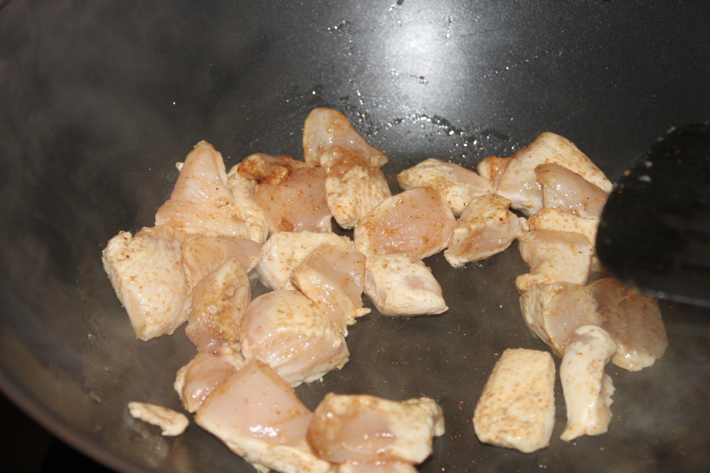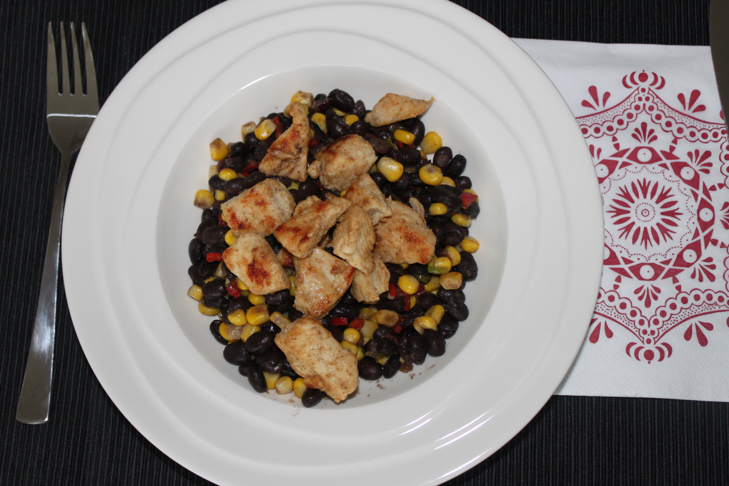 Verhit wat olie in een koekenpan. Snijd de kip in blokjes en marineer met de komijn, zout en chilipoeder. Snijd de peper, ui en bosui fijn. Spoel de zwarte bonen schoon en laat de maïs uitlekken. Bak de kip bruin en haal hem dan uit de pan en zet apart. Doe in dezelfde pan de peper, ui en bosui. Roerbak kort totdat je de ui begint te ruiken en voeg dan de bonen en maïs toe. Verwarm de tortillas volgens de instructies op de verpakking. Schep de bonen op de borden en maak af met de kip.
