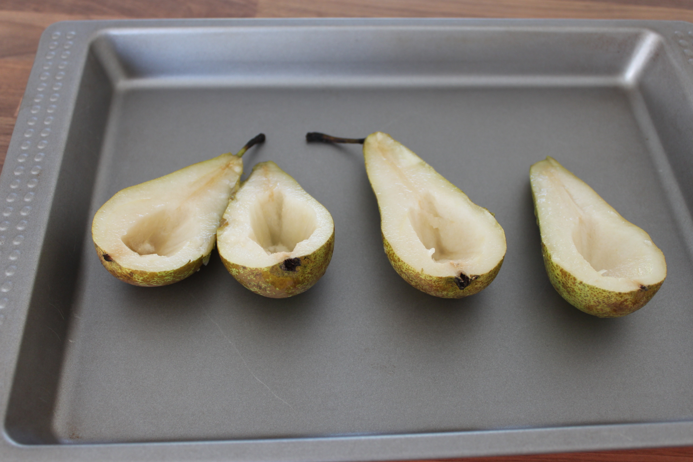 Verwarm de oven voor op 170 graden en stel in op 10 minuten. Was de peren en snijd ze in de lengte door de midden. Verwijder het klokhuis en leg ze met de binnenkant naar boven in een ovenschaal. Bak de peren in 10 minuten gaar.