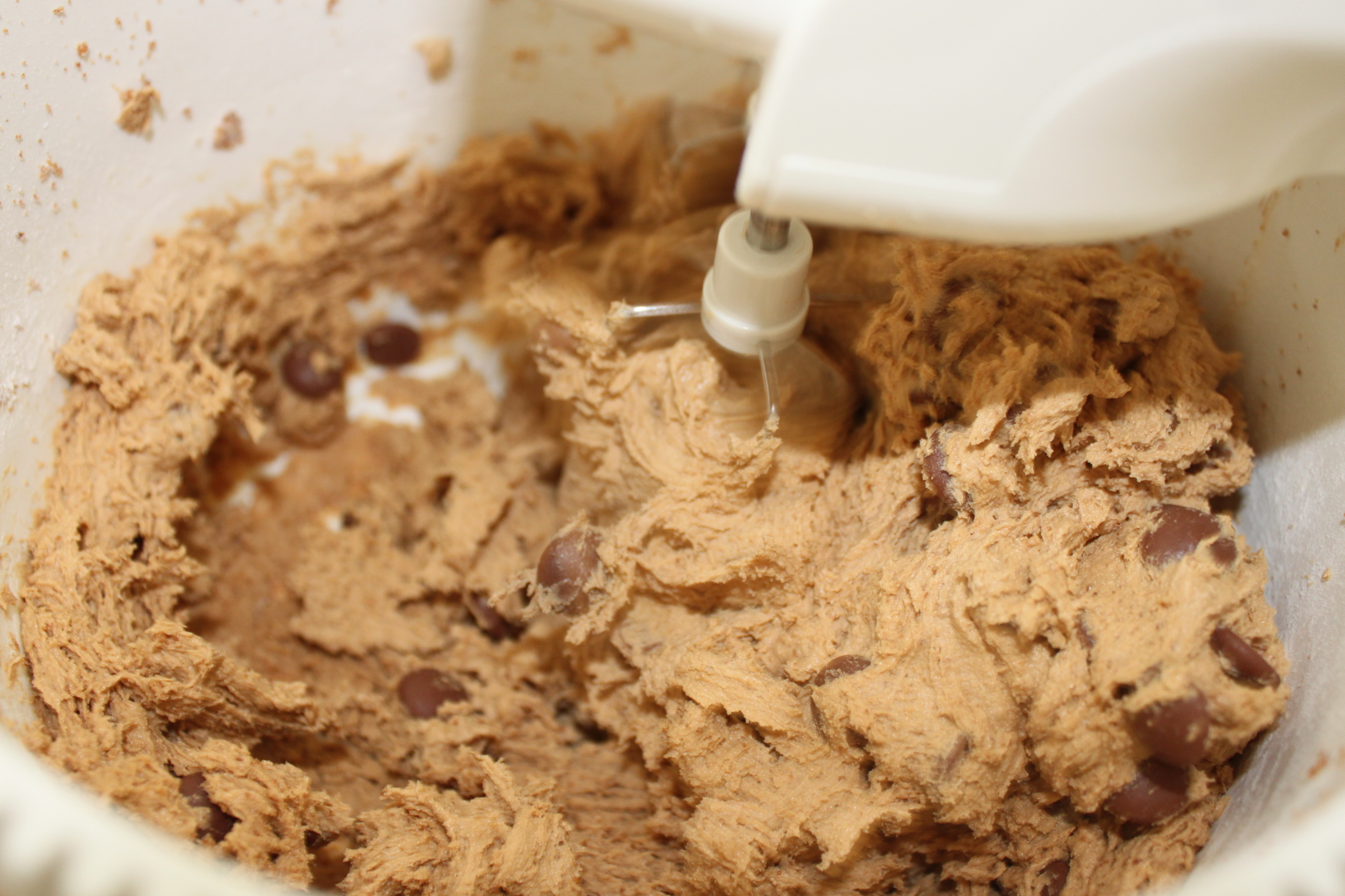 Meng de bloem, het zout en de baking soda en zet apart. Doe de boter en suiker in de mixer en mix op stand 3/4. Als het mooi gemengd is voeg je het vanille-extract en de eiwitten toe. Mix gedurende 1 minuut. Voeg dan de bloem en chocolate chips toe en meng goed door.