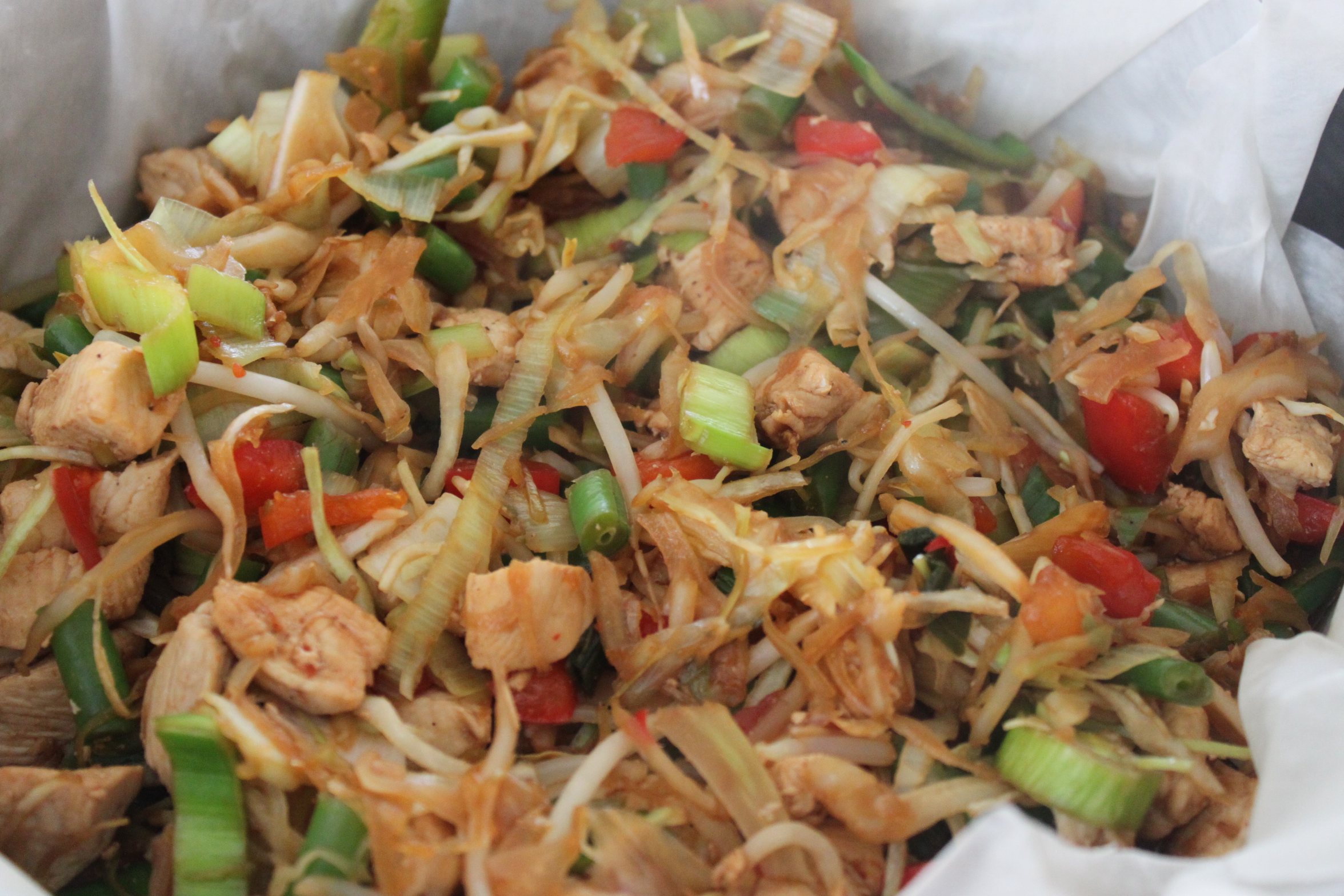 Verhit wat olijfolie in de pan. Snijd de kip in kleine blokjes, doe samen met wat zout, peper en chilivlokken in de pan en roerbak bruin. Voeg de wokgroente toe en bak drie minuten mee. Voeg twee eetlepels sojasaus toe en meng goed.