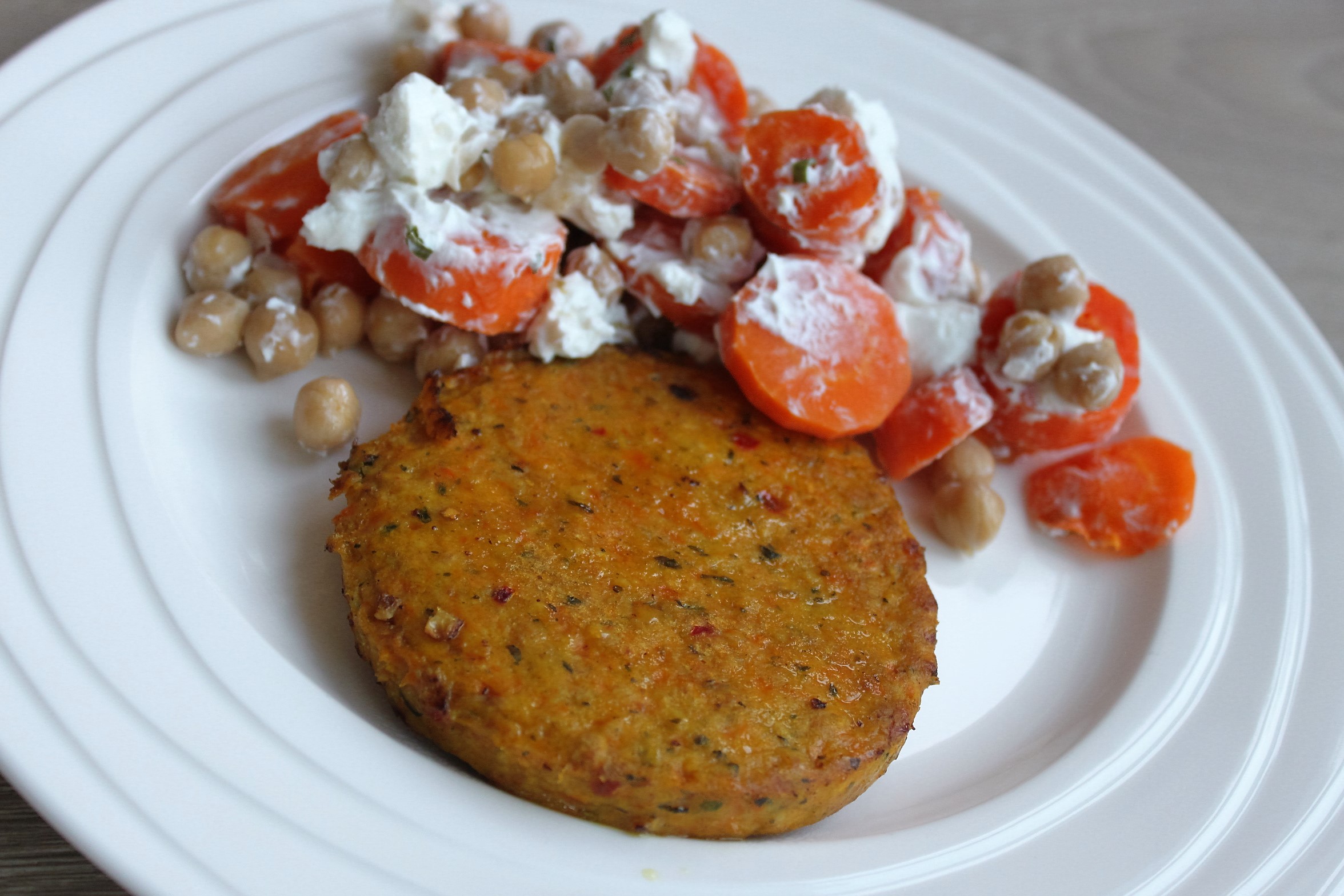 We aten als laatste de pompoen zoete aardappelburger. Ik bedacht dat deze wel lekker zou smaken bij wortels uit de oven met kikkererwten en geitenkaas. Dus dat aten we erbij.