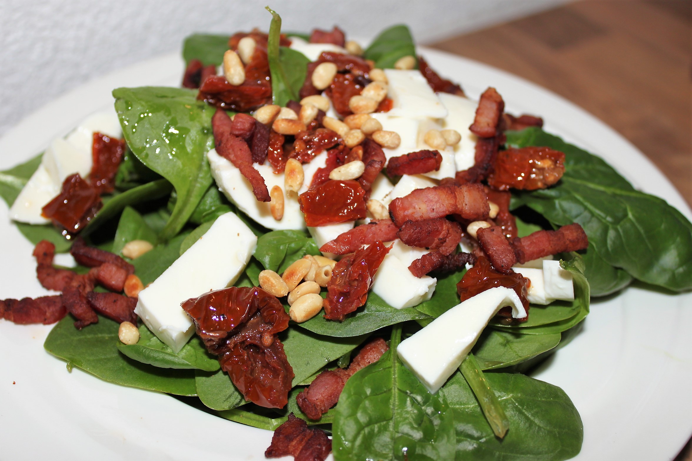 Verdeel de spinazie over de borden (waarschijnlijk houd je wat over) en snijd nu de mozzarella en zongedroogde tomaatjes in stukjes. Verdeel over de borden. Maak af met de spekjes en pijnboompitjes. (Sprenkel eventueel nog wat balsamico-azijn over de salade.) Eet smakelijk!