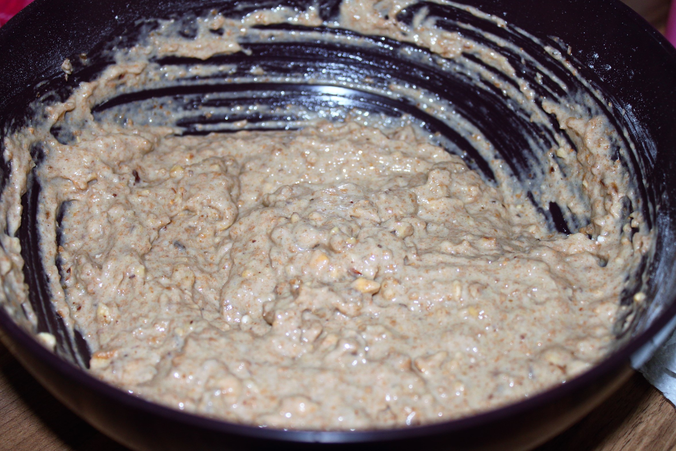 Mix/klop het speltbloem, de bakpoeder en het zout door het beslag. Als je geen bloem en bakpoeder meer ziet, roer je voorzichtig de noten door het beslag.