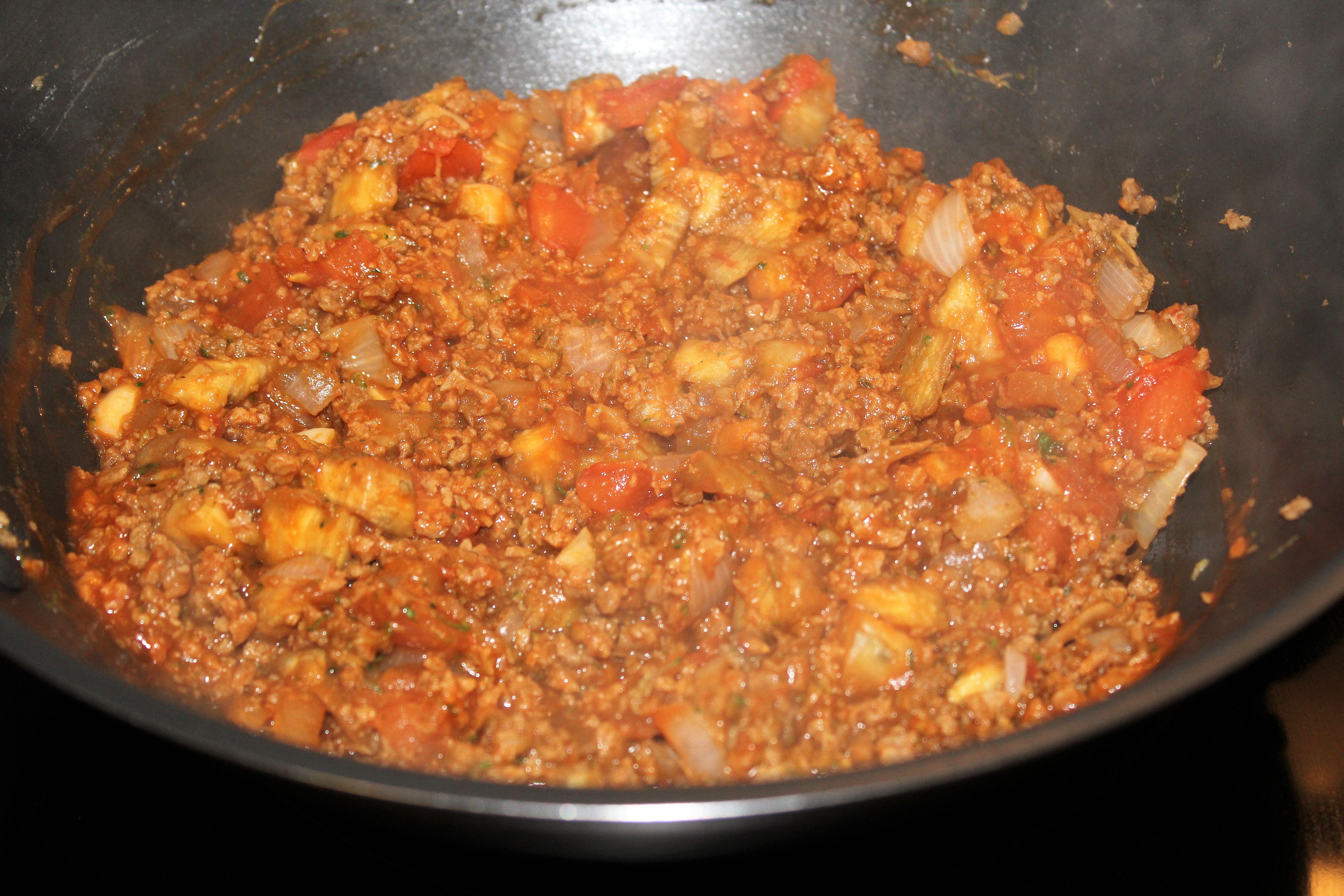 Snipper de ui en snij de knoflook fijn en fruit met wat olijfolie in een pan. Snij vervolgens de tomaten en rasp de courgette. Doe dit samen met het vegetarische gehakt en het vruchtvlees van de aubergines bij de ui en de knoflook. Roerbak kort mee. Doe vervolgens de tomatensaus er beetje bij beetje bij en meng alles door elkaar. Gebruik niet te veel saus, want dan wordt het mengsel te vloeibaar.