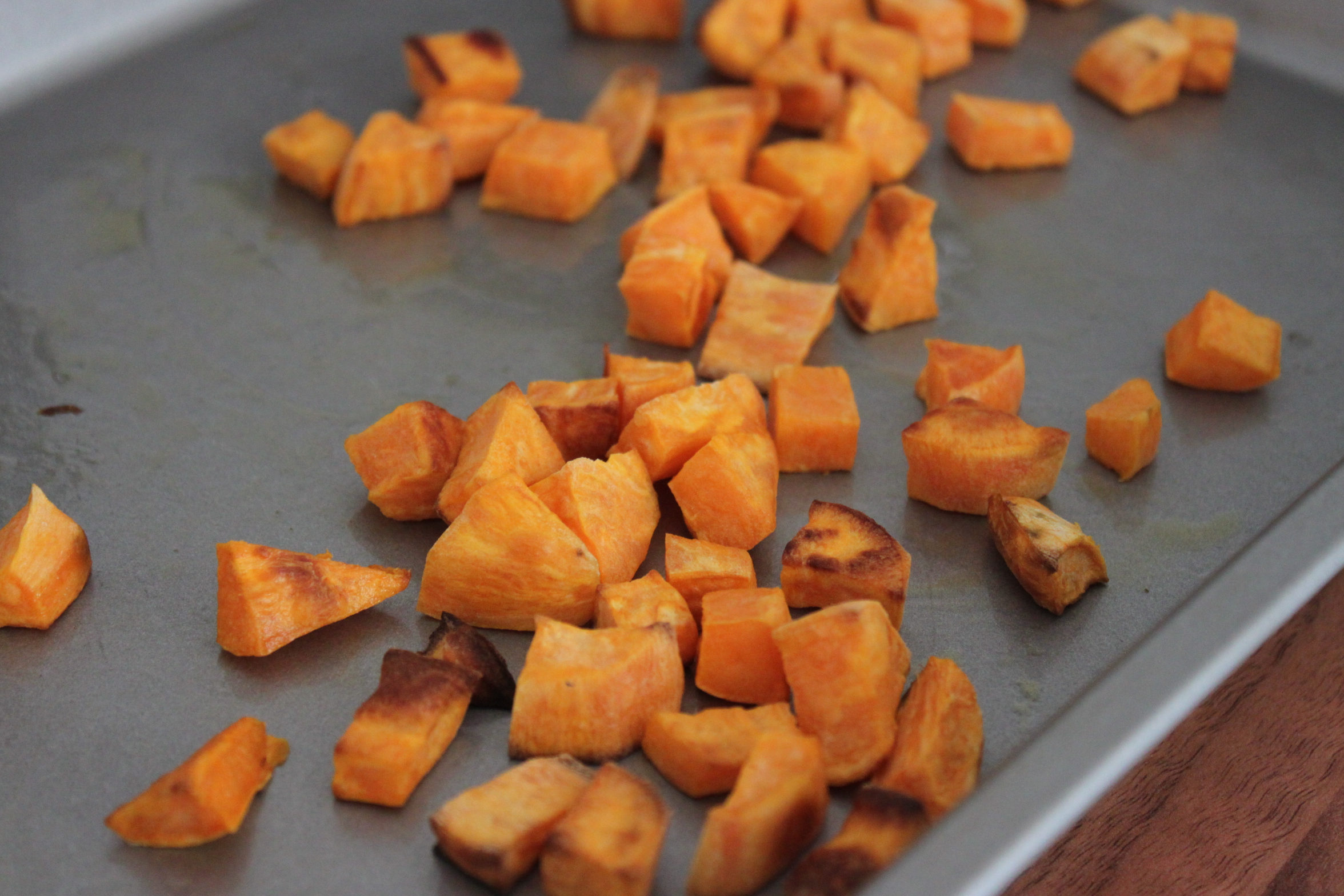Verwarm de oven voor op 200 graden en stel in op 20 minuten. Maak een kippenbouillon met het bouillonblokje en water. Schil de zoete aardappel en snijd in blokjes en besprenkel met wat olijfolie. Bak de zoete aardappel in 15-20 minuten gaar.