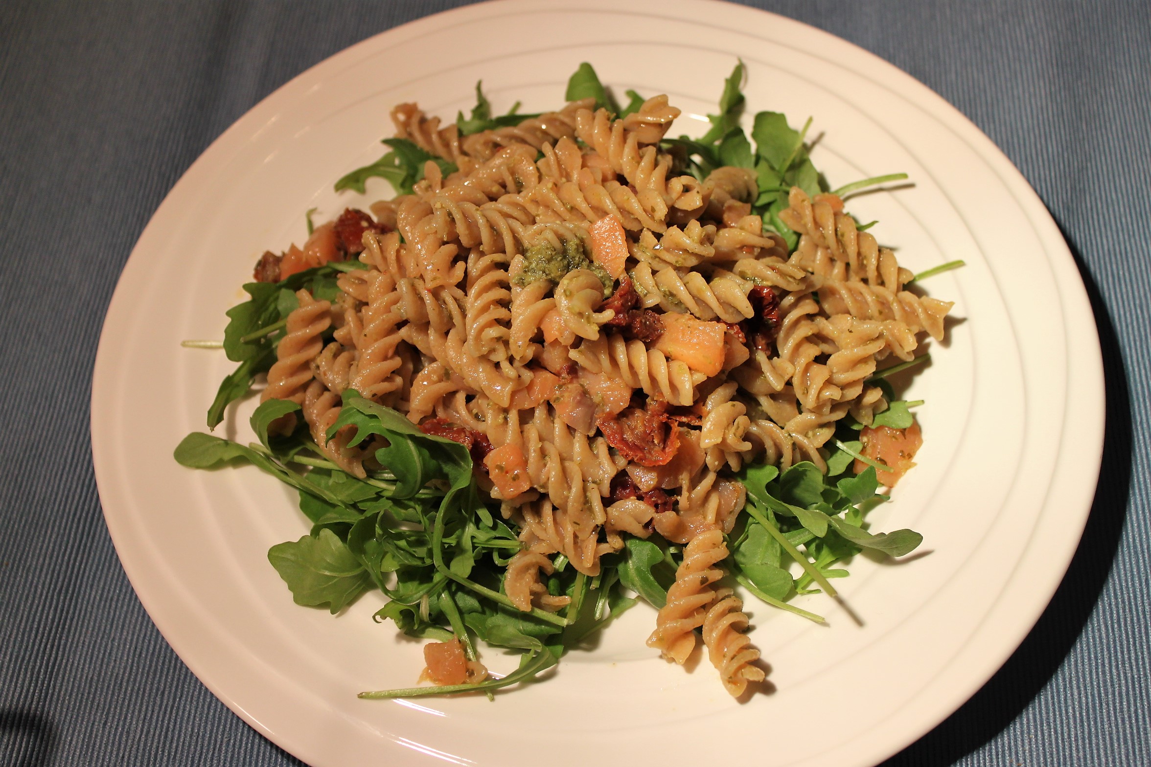 Kook de pasta volgens de instructies op het pak gaar. Snijd ondertussen de gedroogde tomaatjes fijn en doe dit samen met de zalmsnippers in een kom. Als de pasta gaar is, giet je deze af en doe je deze bij de zalm en gedroogde tomaatjes. Voeg nu de pesto naar smaak toe en schep goed door. Verdeel de ruccola over de borden en leg hierop de pasta. Eet smakelijk!