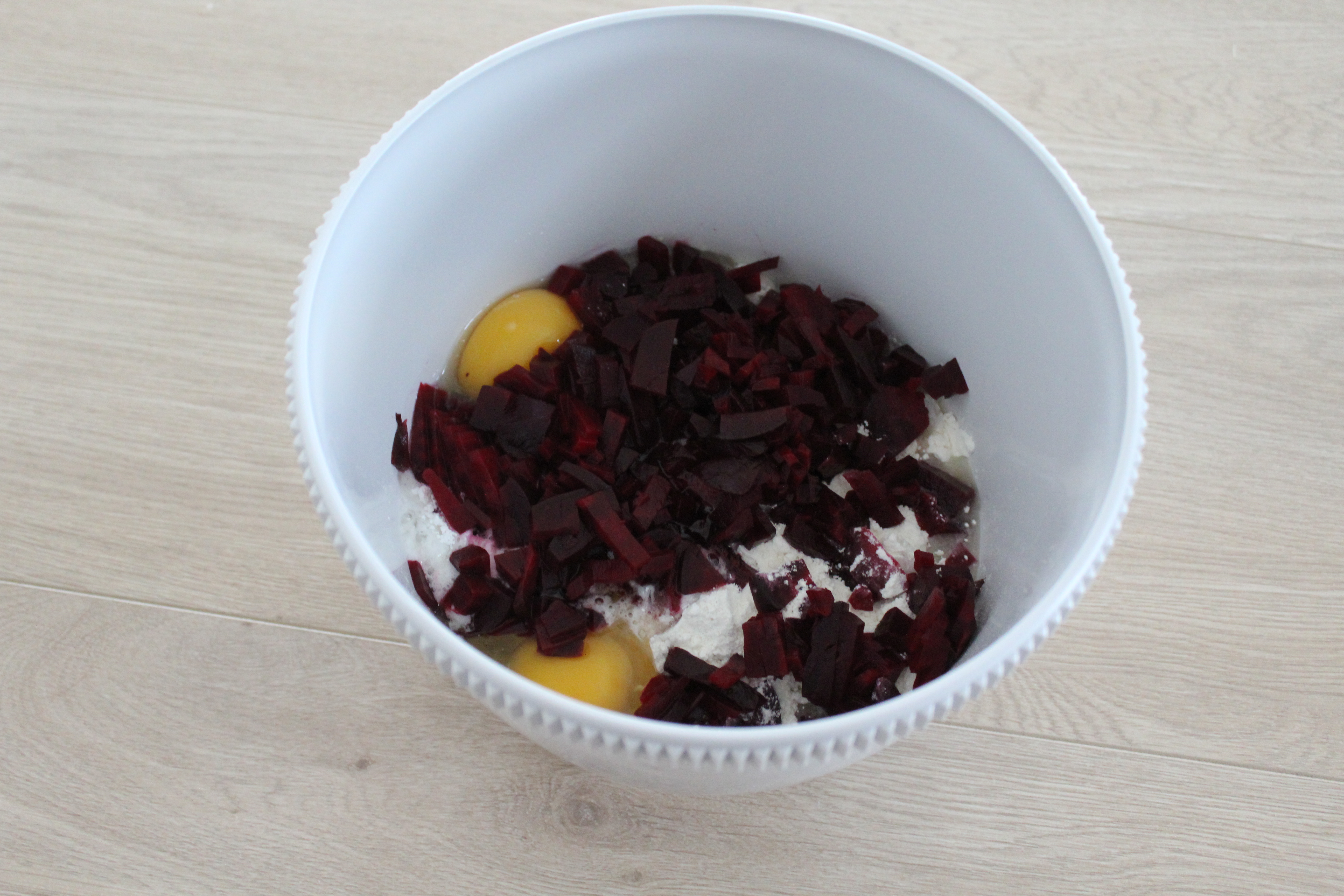 Snij ondertussen de rode bieten in kleine stukjes en doe deze ook bij het mengsel. Meng het nog even goed door elkaar en vul vervolgens de vormpjes met het mengsel. Zet de vormpjes in de oven en bak de muffins in ongeveer 40 minuten gaar. Ik at de muffins met wat extra honing en een beetje yoghurt.