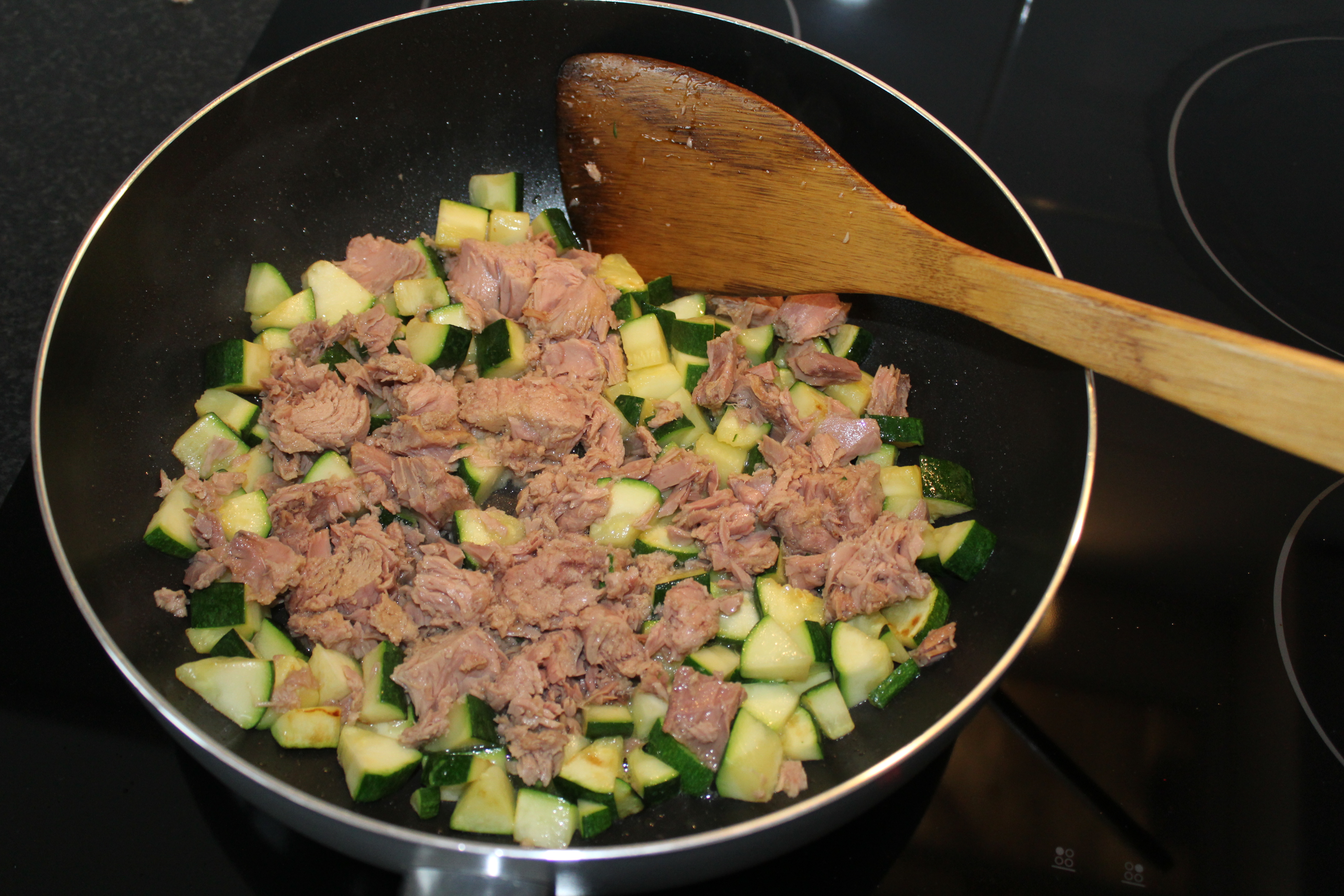 Snij de courgette in kleine blokjes en bak deze gaar in de pan. Doe vervolgens de 2 blikjes tonijn erbij en bak het kort mee met de courgette.