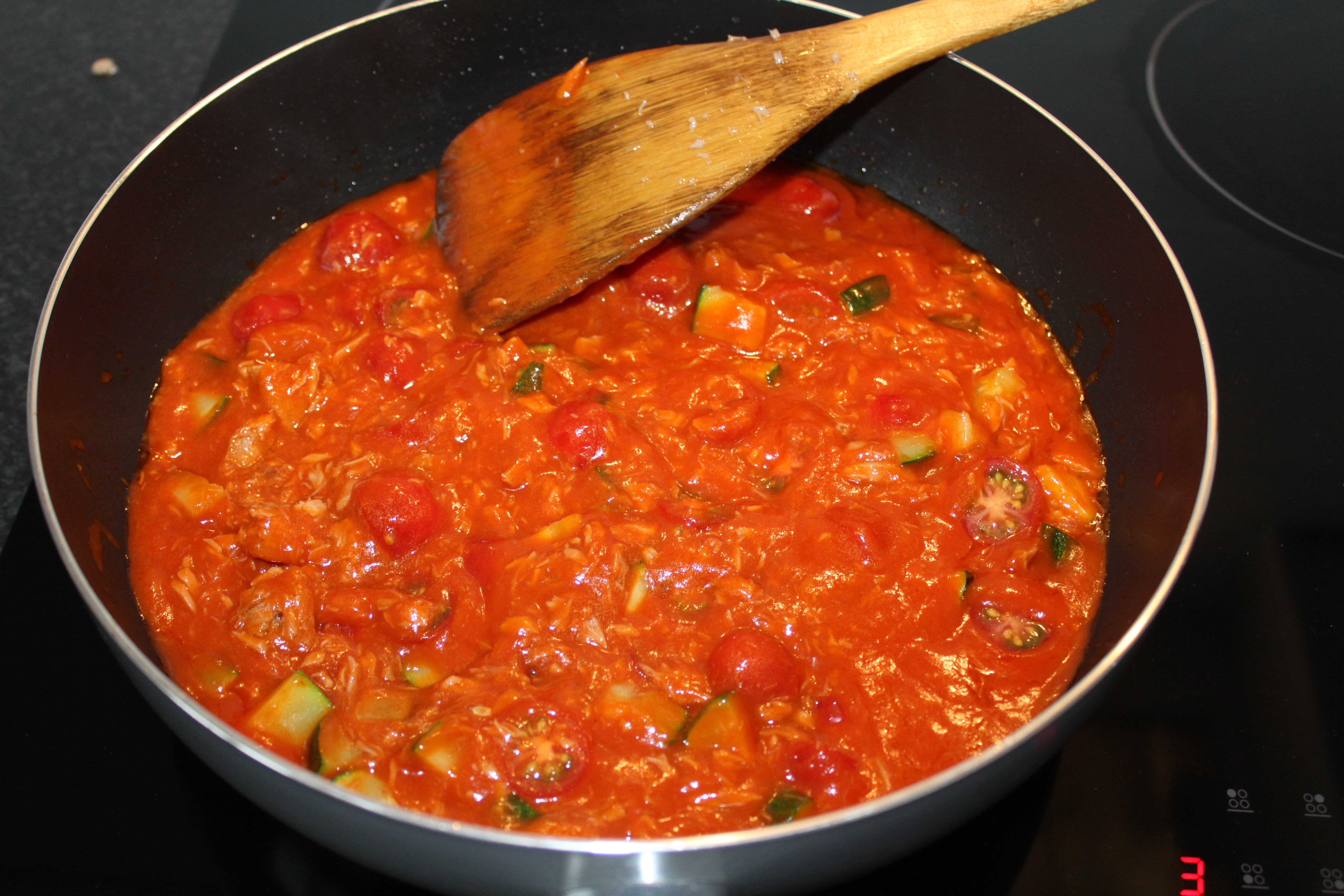 Ondertussen snij je de cherrytomaatjes door de midden. Doe deze dan ook in de pan en giet de 2 pakjes tomatensaus erbij. Roer het lekker door en haal dan de pan van het vuur.
