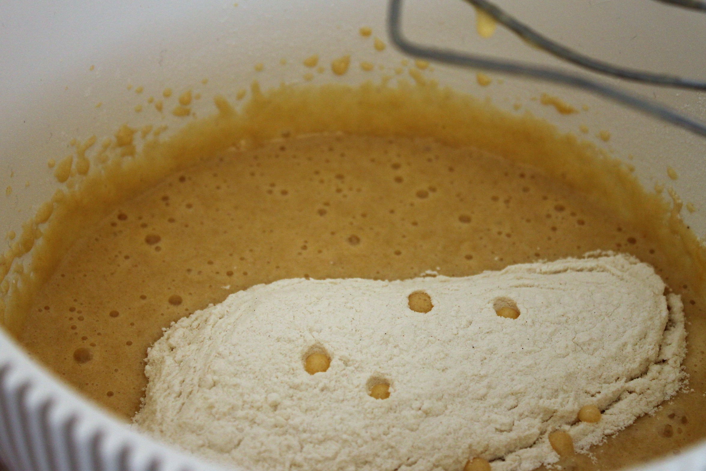 Mix in een kom de eieren en suikers tot een luchtig mengsel. Voeg nu de appelmoes toe en mix ook in twee delen het zelfrijzend bakmeel toe aan het beslag en blijf mixen tot het bakmeel volledig is opgenomen en je een glad beslag hebt.