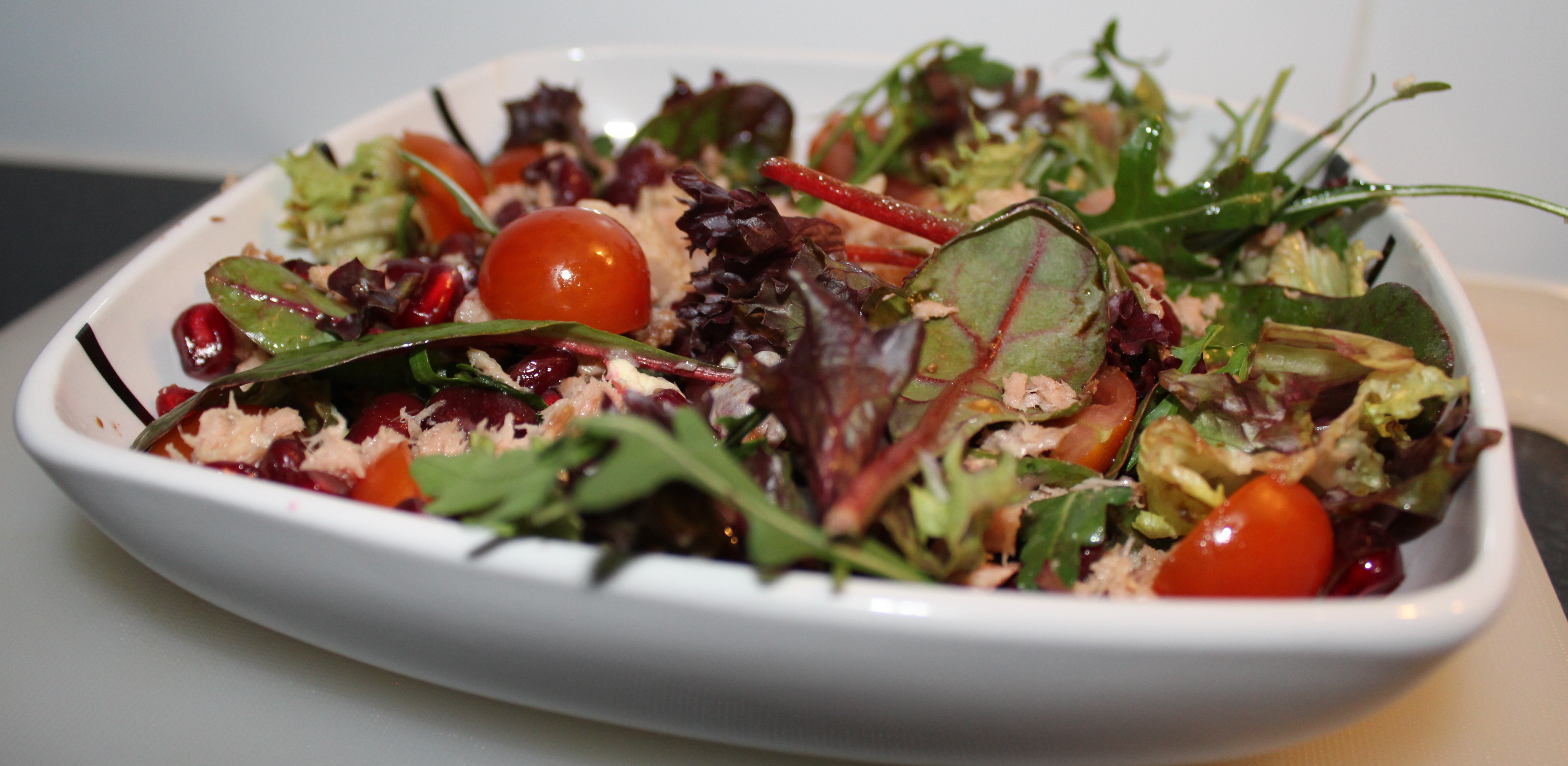 Doe de helft van een zakje rucola sla op een bord. Ik had een zakje van 75 gram en daar de helft van genomen. Dan heb ik morgen nog een beetje. Snij de cherrie tomaatjes door de helft, spoel de kidneybonen af onder de koude kraan en doe dit bij de sla. Snij vervolgens de granaatappel en verzamel de pitjes. De pitjes doe je ook bij de sla. Doe de tonijn bij de sla, hussel alles door elkaar en maak af met een scheutje olijfolie en balsamico dressing. Eet smakelijk!