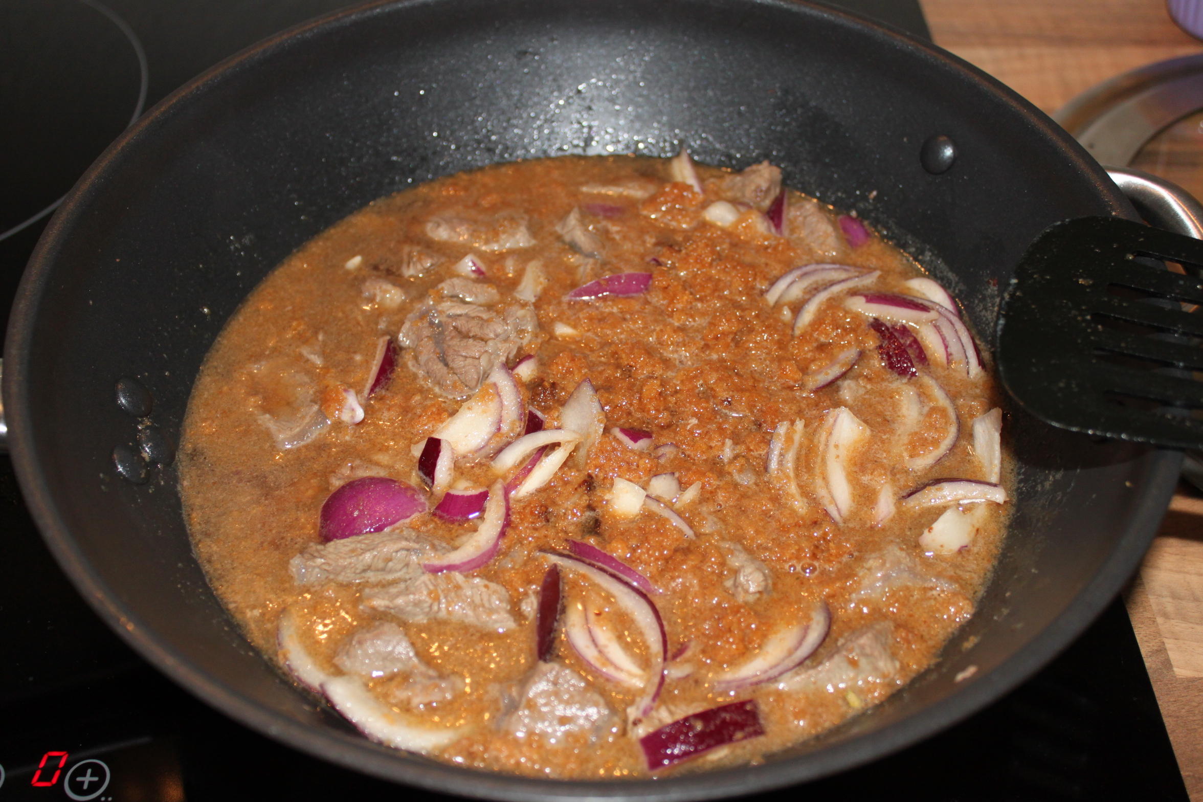 Laat nog even dertig minuten pruttelen en serveer met zoete aardappelpuree of -frietjes.
