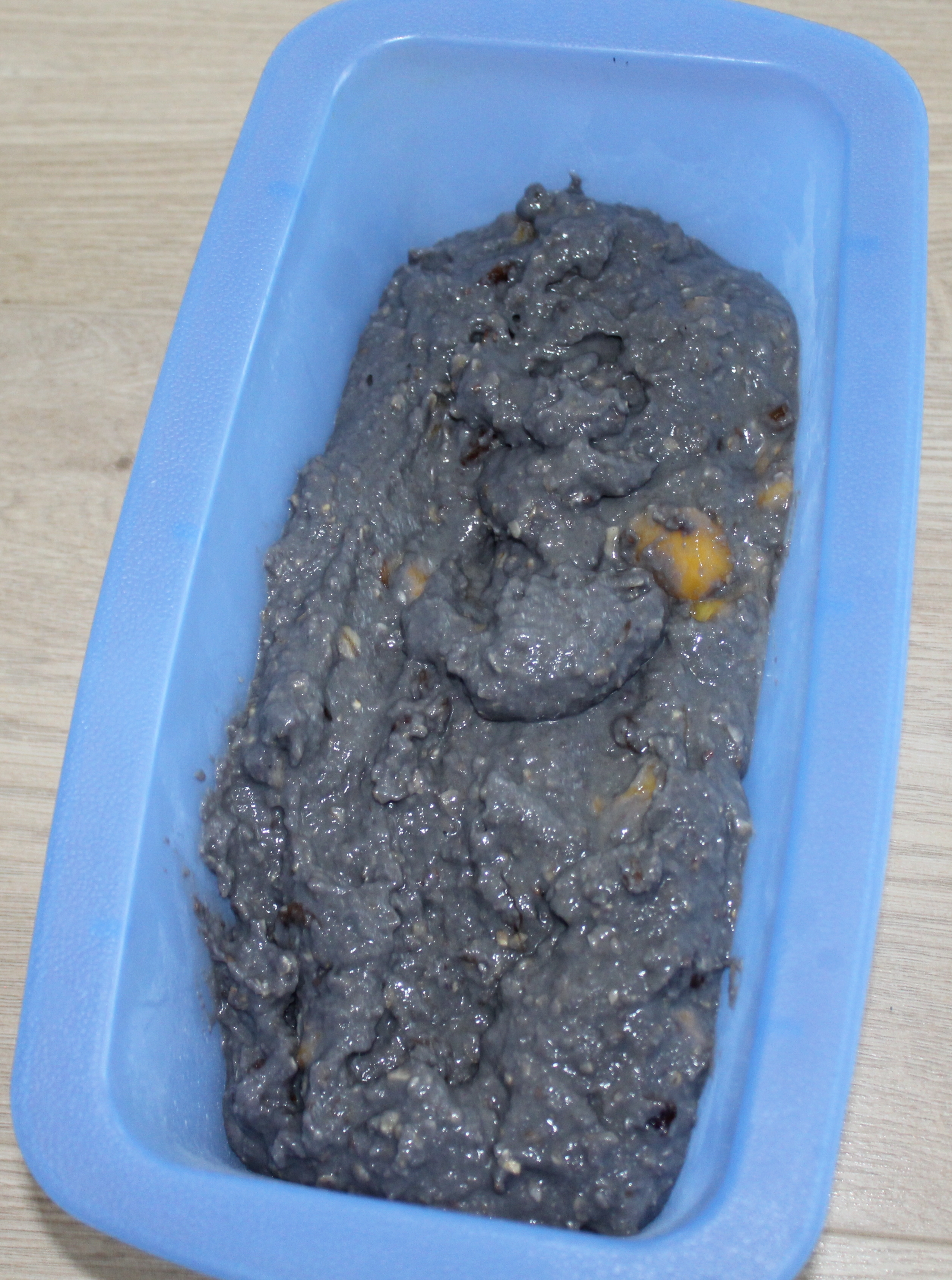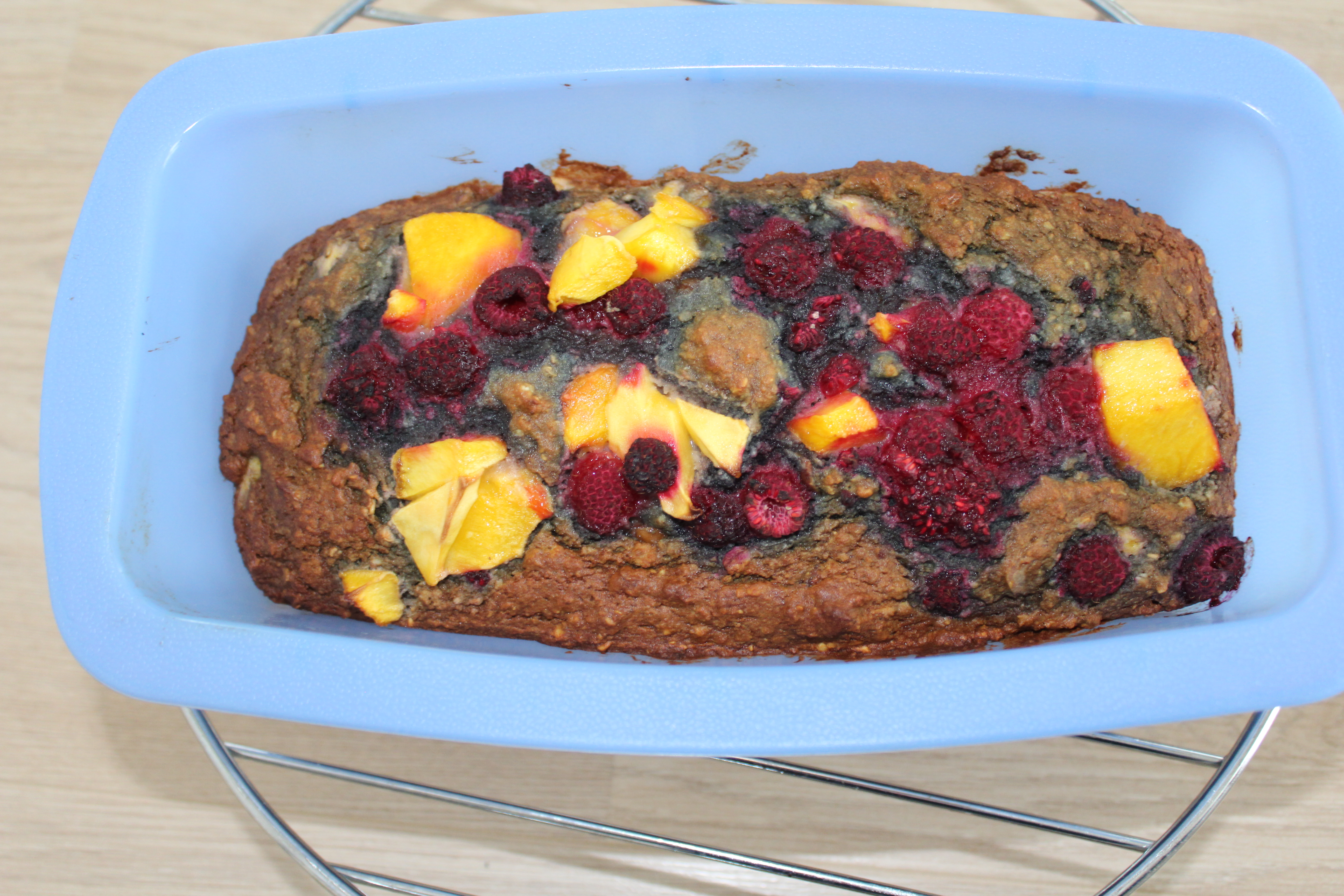 Snij ondertussen de dadels in kleine stukjes en roer deze samen met de helft van de frambozen en de mango door het beslag. Giet het mengsel vervolgens in een siliconen cake vorm en strooi de rest van het fruit erover heen.