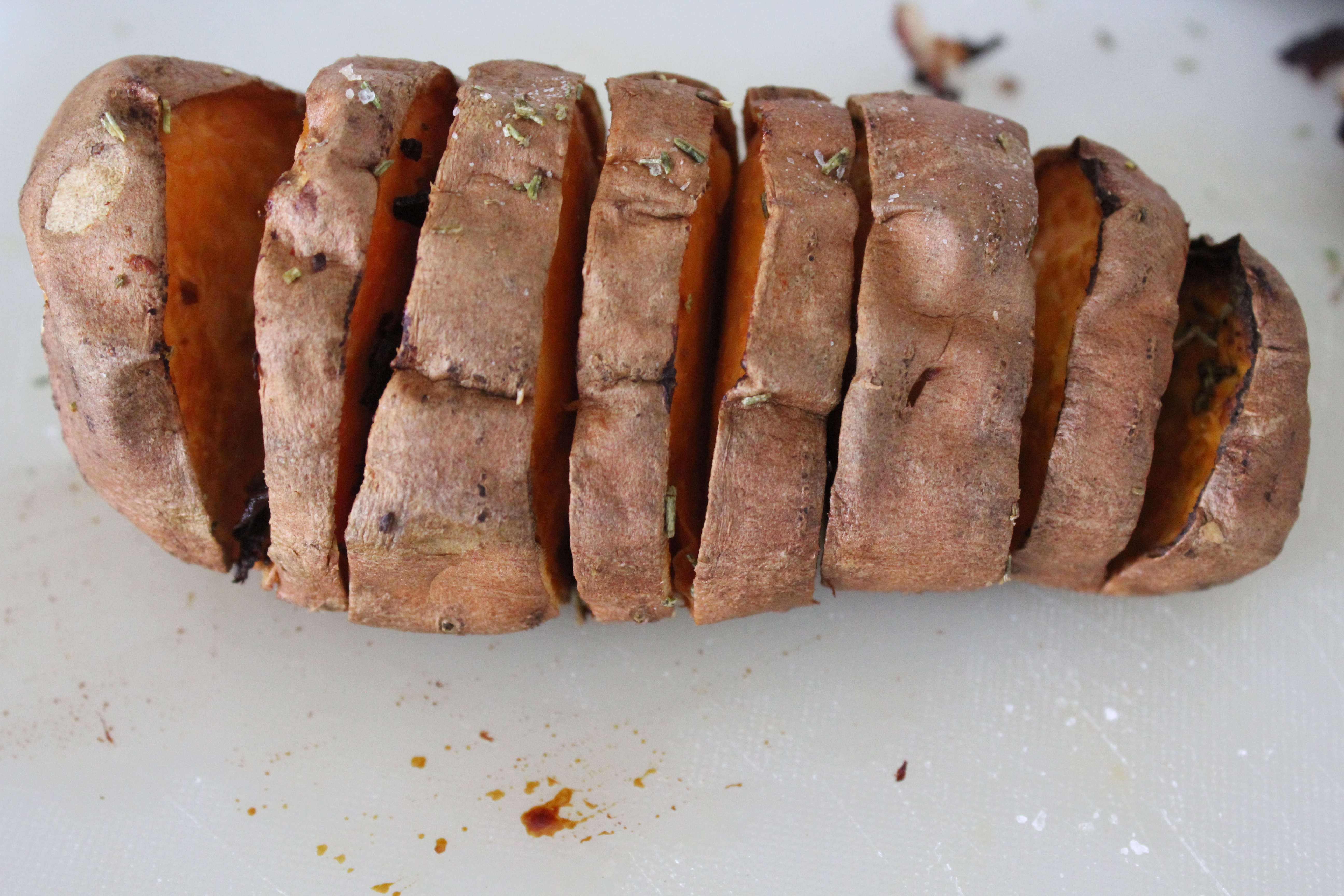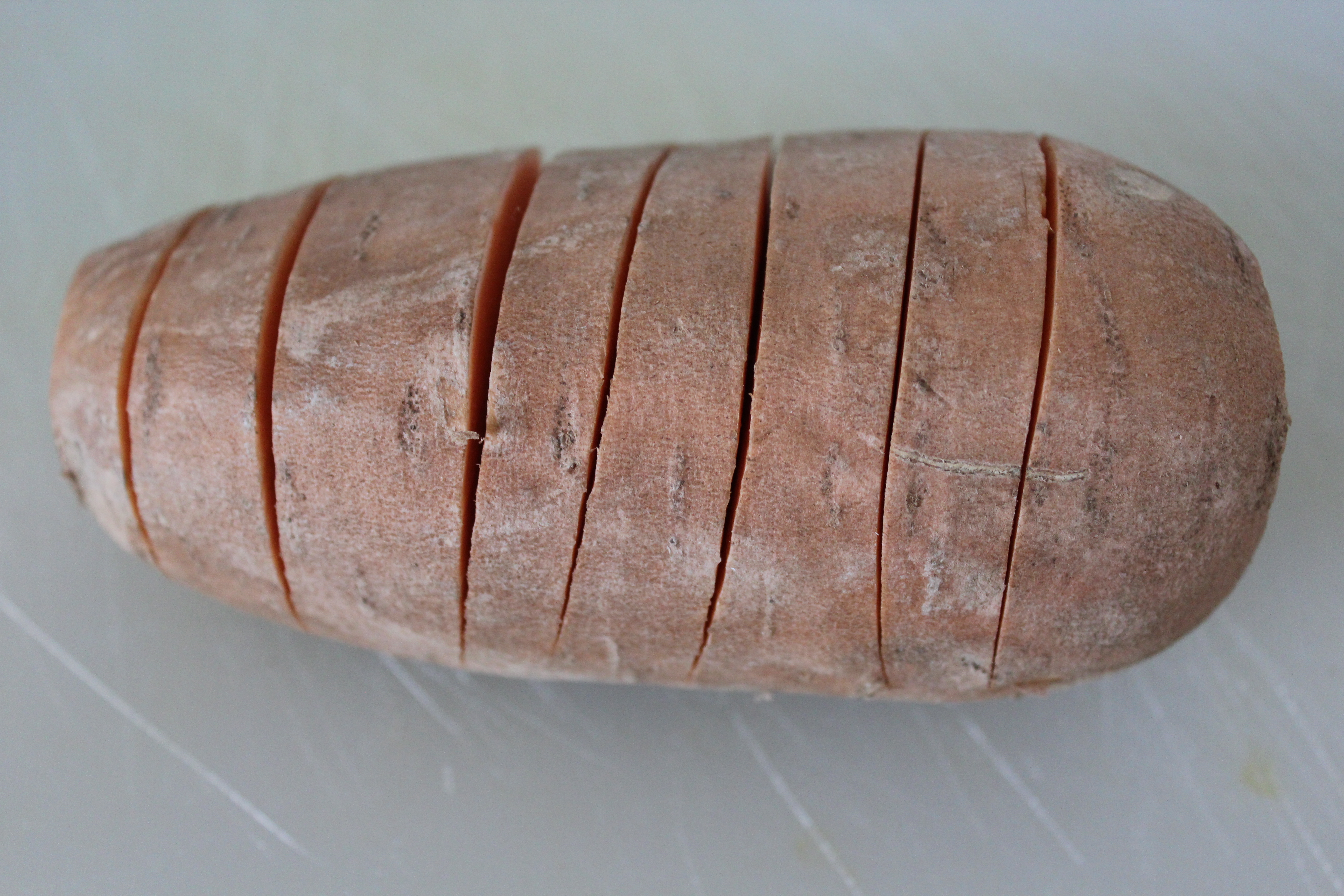 Was de zoete aardappel goed onder de kraan en snij een klein stukje van beide zijkanten af. Maak vervolgens inkepingen in de zoete aardappel. Let erop dat je ze diep genoeg maakt, anders wordt de zoete aardappel in het midden niet gaar.