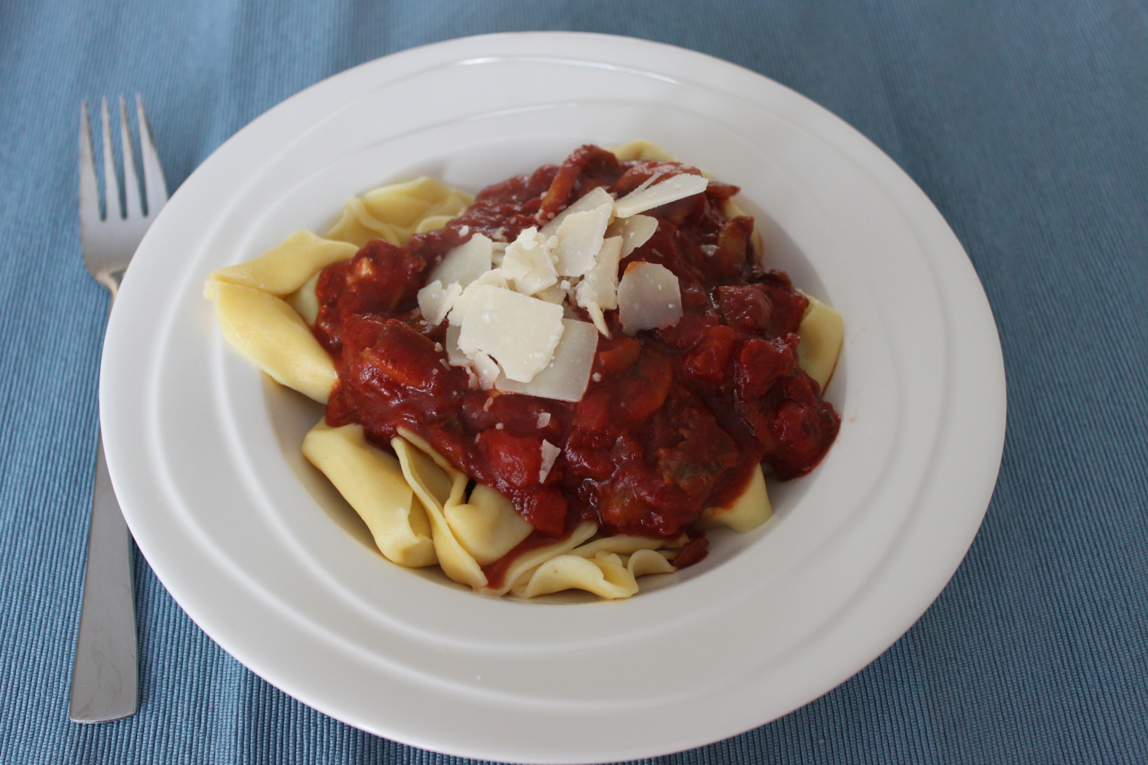 Schep de pasta op de borden, giet de saus erover en maak af met de Parmezaanse kaas vlokken. Eet smakelijk!