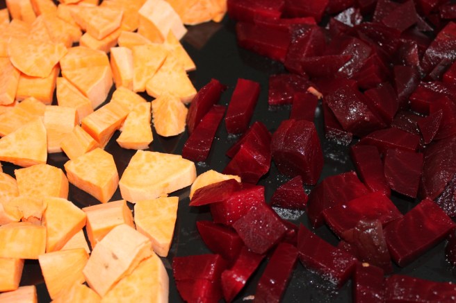 Verwarm de oven voor op 200 graden en stel in op 30 minuten. Schil de zoete aardappel en snijd in blokjes. Leg de blokjes op een bakplaat. Snijd de rode bieten in blokjes en leg ook op de bakplaat. Bak de zoete aardappel en rode bietjes in 30 minuten gaar. Keer regelmatig.