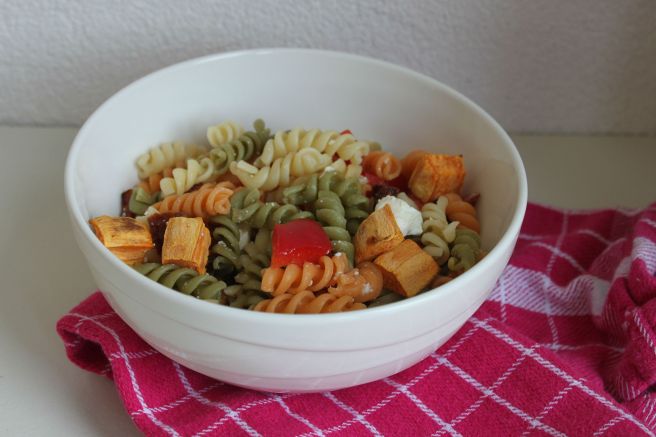 Giet de gekookte pasta af en spoel af met koud water. Als de pasta lauw tot koud is, doe je deze in de kom en meng je alles goed. Als laatste voeg je de zoete aardappel toe. Verdeel de salade over de borden en serveer. Eet smakelijk!