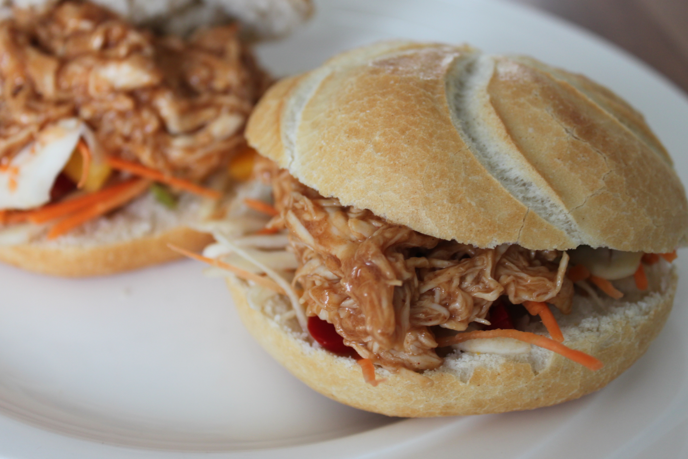 Snijd de broodjes onder, beleg met de rauwkost en maak af met de pulled chicken. Eet smakelijk!