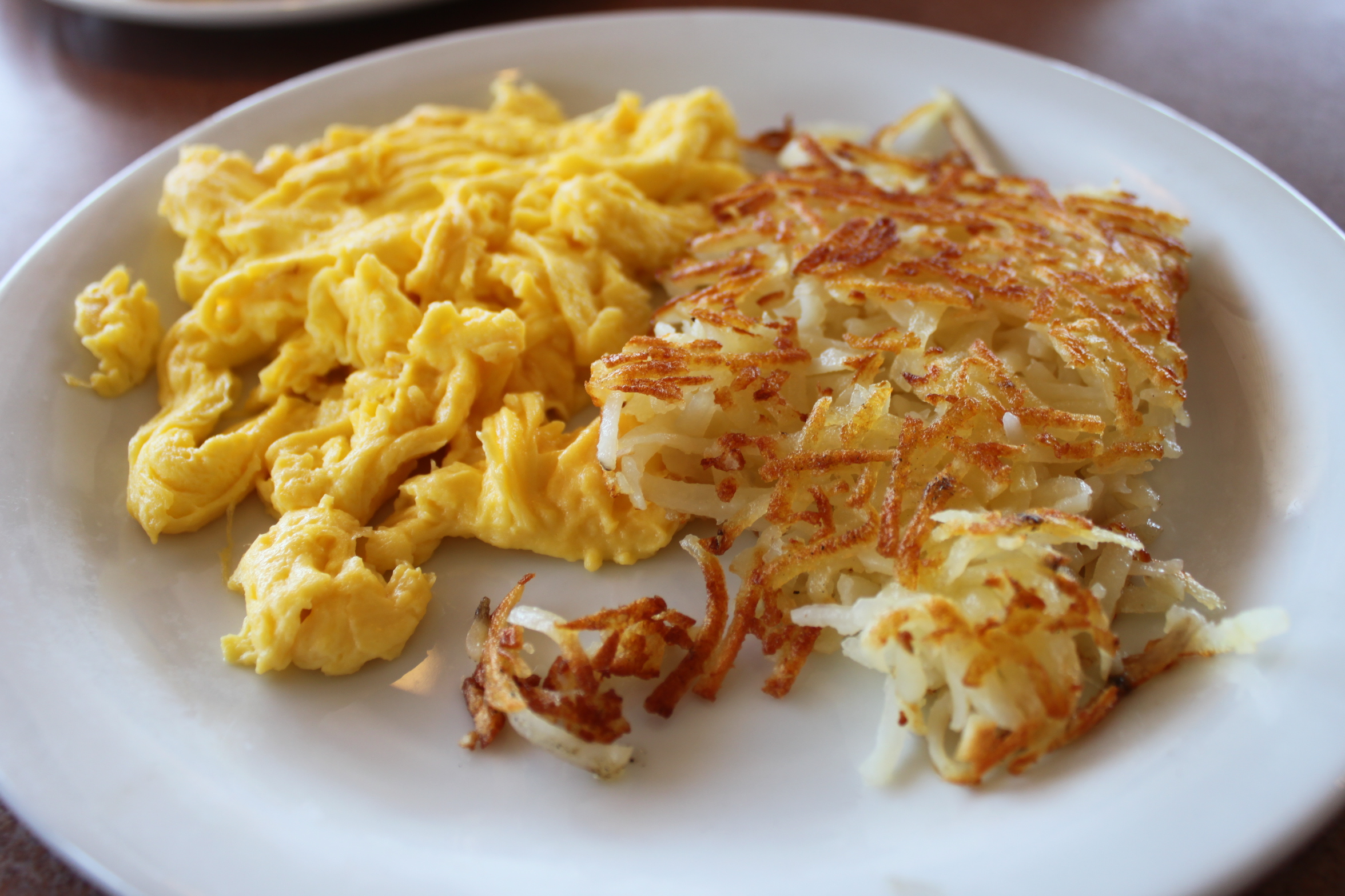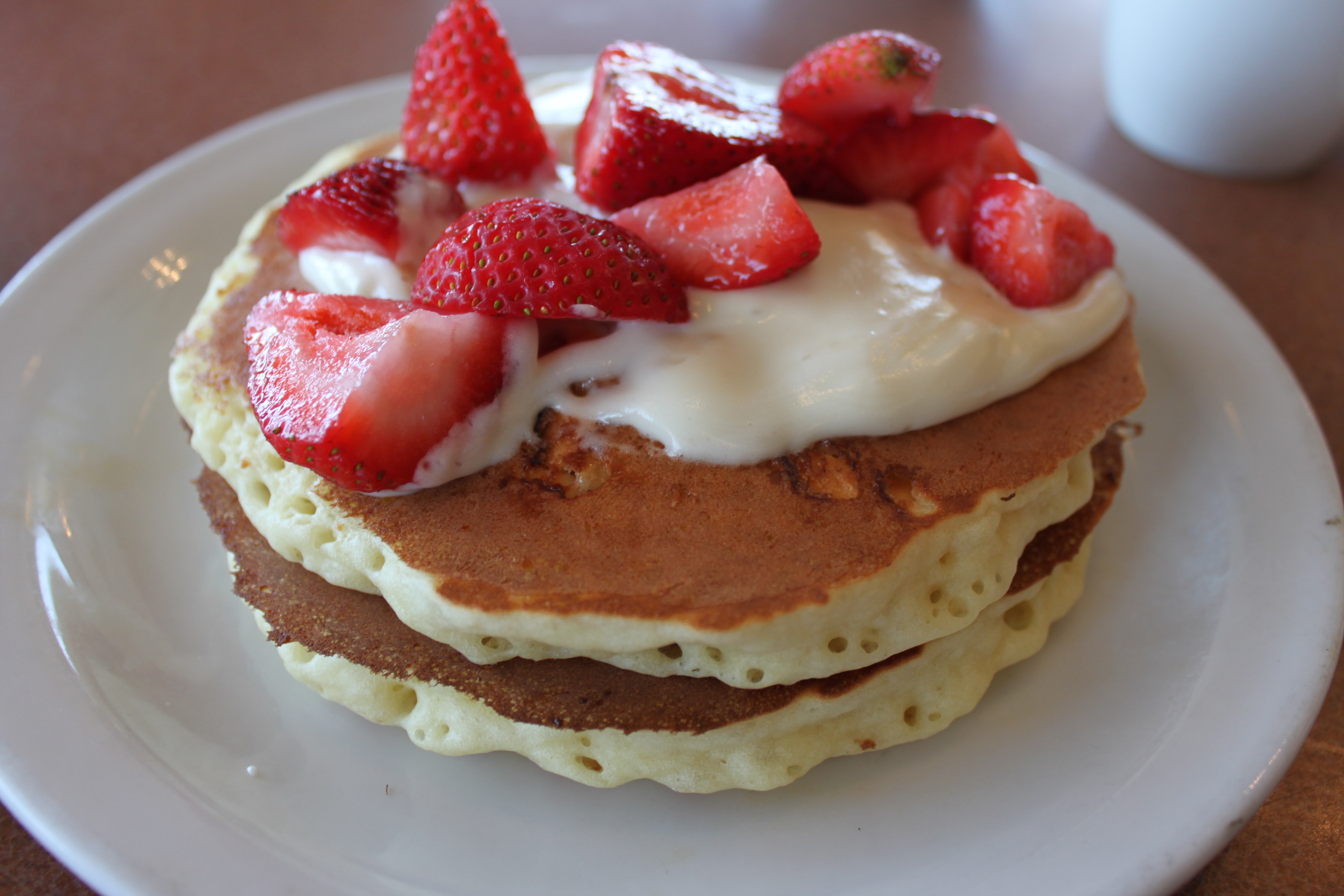 De pancakes worden van karnemelk gemaakt en zijn erg luchtig. Ik koos voor vanille en aardbei en je krijgt er automatisch hash brown, eieren en bacon of worstjes bij. Ik liet de bacon en worstjes aan mij voorbij gaan, wat me een verbaasde blik van de serveerster opleverde, en nam alleen hash brown en eieren.