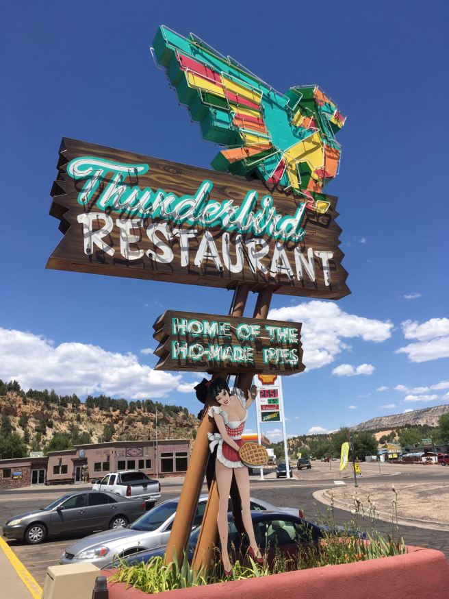 Onderweg naar Bryce Canyon en Zyon Canyon reden wij langs het Thunderbird Restaurant. Martijn wilde heel graag homemade pie eten en we zagen langs de weg meerdere keren een bord van dit restaurant staan. Dus toen we terugkwamen van Bryce Canyon en onderweg waren naar Zyon Canyon, besloten we hier te stoppen voor home made pie.