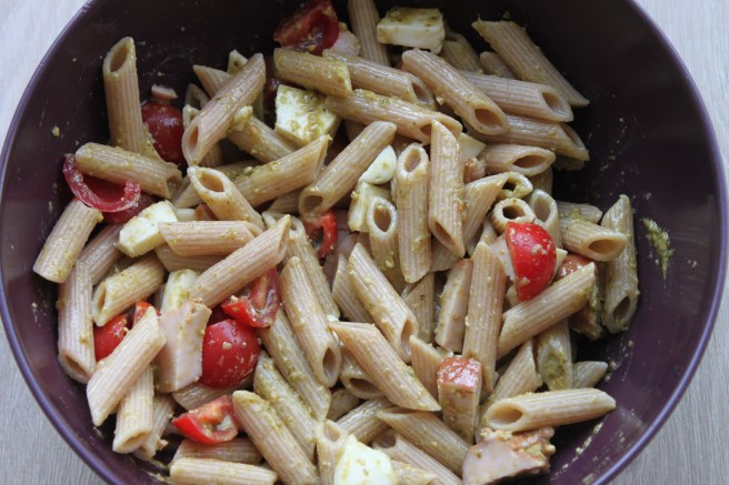 Vandaag eten we een makkelijke pastasalade met pesto en kip. Deze maaltijd eet ik tussen de middag, omdat ik ’s ochtends sport en mijn man eet het ’s avonds voor het sporten. Het recept vind je hier.