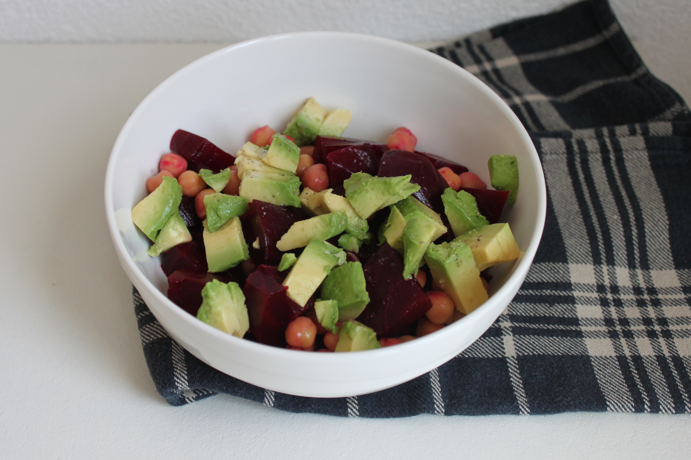 Ik maak een salade klaar van kikkererwten, avocado en rode bietjes. Het recept vind je hier
