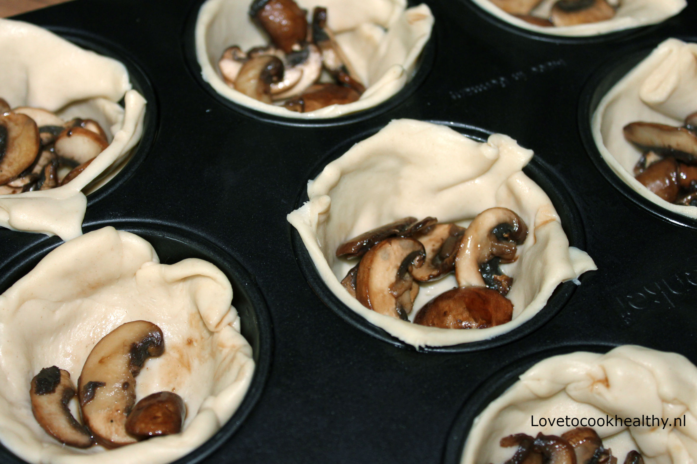 Verwarm de oven voor op 180 graden. Vet een muffinblik in met olijfolie. Snijd de champignons in plakjes, doe wat olijfolie in een pan en roerbak de champignons tot ze bijna gaar zijn. Maak op smaak met zout en peper.