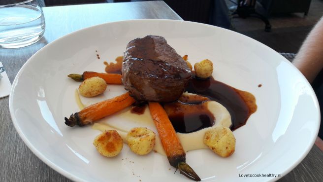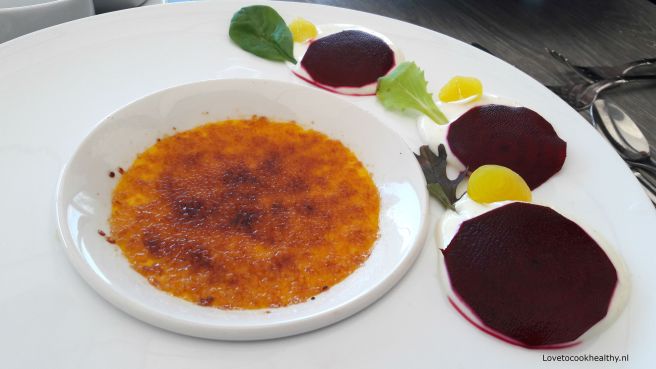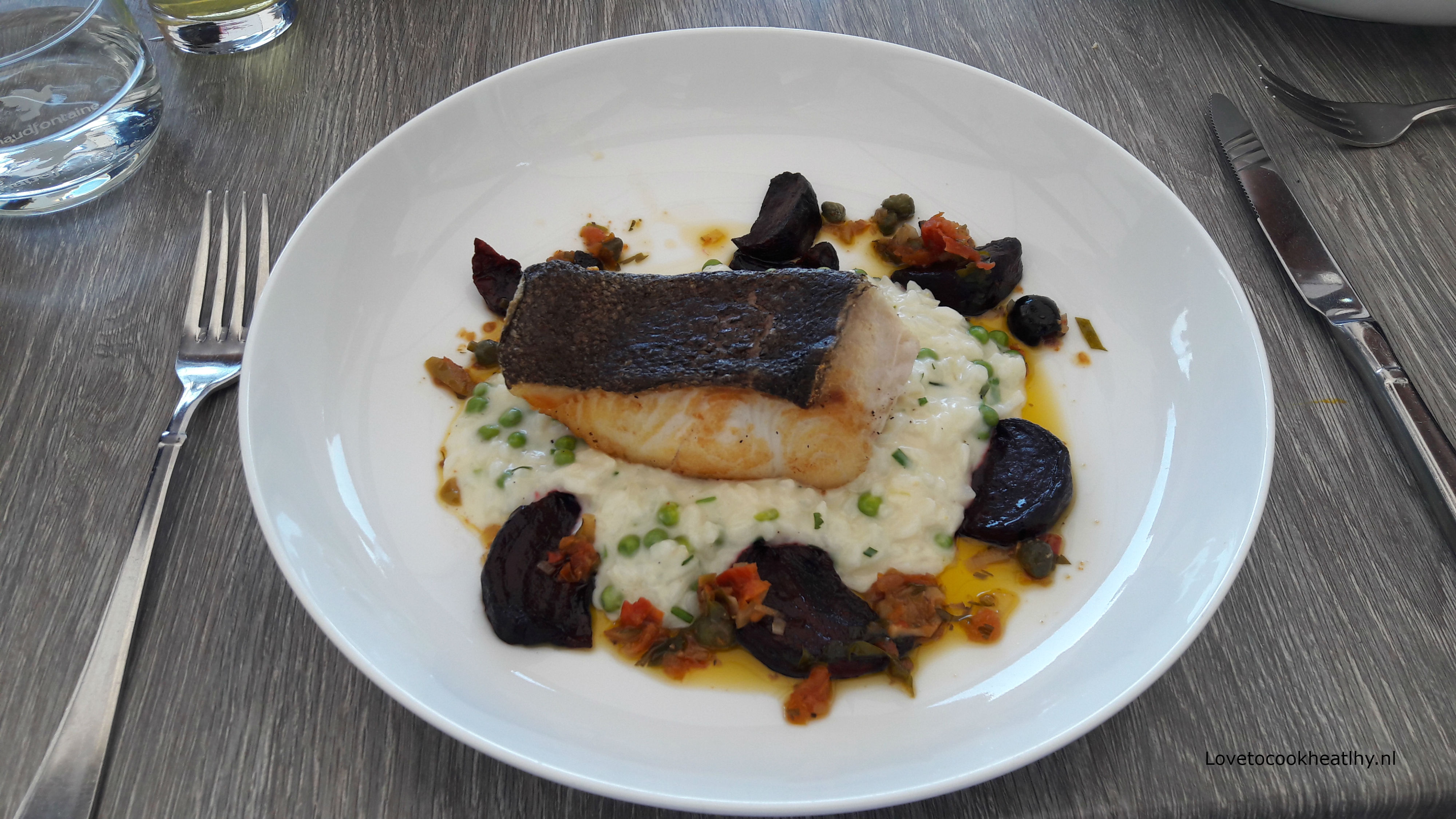 Ons voorgerecht was een halve portie crème brûlée van wortel kokos en gember met geiten hangop en ingelegde biet. Als hoofdgerecht had ik gebakken heilbot met risotto, anti boise en geroosterde rode biet en als dessert de gepocheerde peer met witte chocolade mousse en walnoot ijs. Nou dat was smullen zeg! De heilbot was wel wat flauw van smaak, die had wel iets gekruid gemogen, maar voor de rest was het heerlijk. Zeker een adresje waar ik weer wil eten.